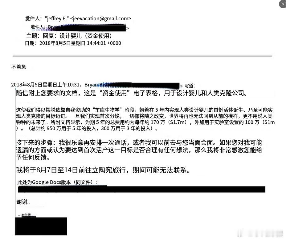 司法部公布的最新一批埃普斯坦的文件中包含了爱泼斯坦与布莱恩·比普斯之间的电子邮件。2018 年,比普斯曾试图为一项旨在通过基因手段增强后代并最终实现人类克隆的项目寻求资金支持。