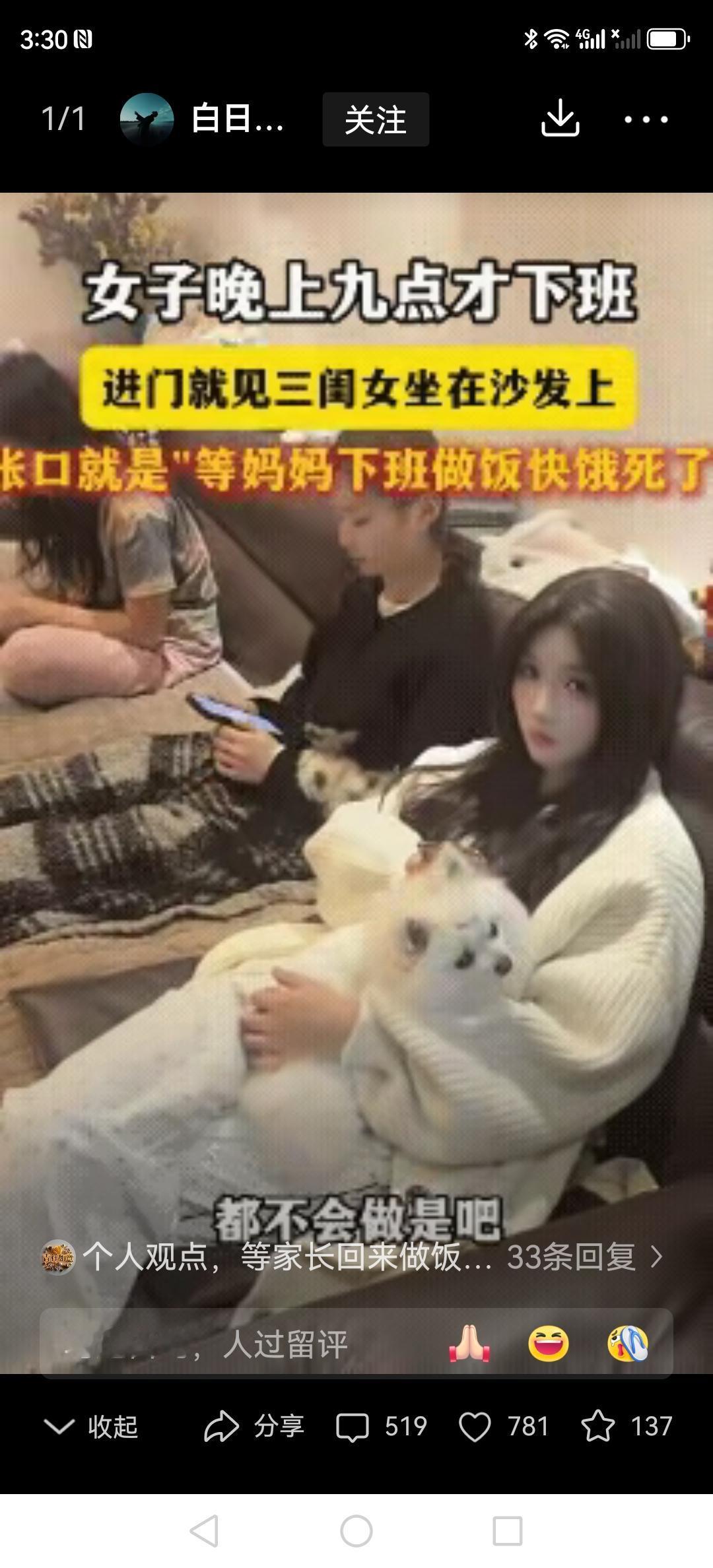 深夜九点多,妈妈累得直不起腰回到家,一开门就看见三个女儿瘫在沙发上刷手机,茶几上空空的,连个碗碟都没摆。 孩子们还理直气壮地凑过来说:"等妈妈回来做饭呀,我们都快饿死啦!"妈妈当时就气得不行,忍不住吼道:"煮碗面条都不会吗?饿死也是你们自己不学着做!" 这样的场景,是不是戳中了很多当爸妈的心? 最近有位妈妈分享的这件事,在网上讨论度特别高。 她从公司加班到晚上九点才拖着疲惫的身体回到家,本以为能吃上口热乎饭,结果看到的却是孩子们只顾着玩手机,连饭都没准备。 这真的是孩子不懂事吗?其实是教育上出了偏差啊! 2025年熊猫青少年研究中心有份报告,说近八成家长都很看重孩子品格的培养,但现实里,有多少家庭是在无底线的溺爱里走偏了呢? 过度地帮孩子把一切都做好,这根本不是爱啊,这是在害他们! 孩子连煮碗简单的面条都不会,以后怎么自己独立生活?当爸妈的真该醒醒了,教孩子点生活小技能,可比给他们留再多钱都重要。 你家的娃,现在能自己动手做点吃的吗? 深夜九点多,妈妈累得直不起腰回到家,一开门就看见三个女儿瘫在沙发上刷手机,茶几上空空的,连个碗碟都没摆。 孩子们还理直气壮地凑过来说:"等妈妈回来做饭呀,我们都快饿死啦! "妈妈当时就气得不行,忍不住吼道:"煮碗面条都不会吗?饿死也是你们自己不学着做!" 这样的场景,是不是戳中了很多当爸妈的心? 最近有位妈妈分享的这件事,在网上讨论度特别高。 她从公司加班到晚上九点才拖着疲惫的身体回到家,本以为能吃上口热乎饭,结果看到的却是孩子们只顾着玩手机,连饭都没准备。 这真的是孩子不懂事吗?其实是教育上出了偏差啊! 2025年熊猫青少年研究中心有份报告,说近八成家长都很看重孩子品格的培养,但现实里,有多少家庭是在无底线的溺爱里走偏了呢? 过度地帮孩子把一切都做好,这根本不是爱啊,这是在害他们!孩子连煮碗简单的面条都不会,以后怎么自己独立生活?当爸妈的真该醒醒了,教孩子点生活小技能,可比给他们留再多钱都重要。你家的娃,现在能自己动手做点吃的吗?家庭教育的悲哀,到底是谁的错