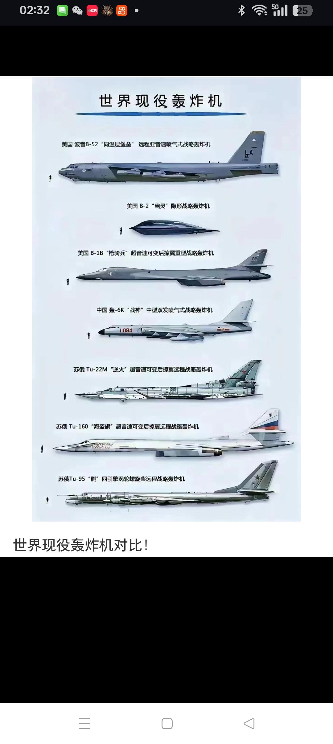 加快战略空军的建设,势在必行! 战略空军是指具备独立执行战略任务能力的空军力量,其核心特征是“空天一体、攻防兼备”,能够对敌方战略目标实施远程打击、战略投送和全域威慑,是国家军事战略的重要支柱。 战略空军的核心能力包括 战略预警与侦察:通过预警机、侦察卫星等系统,实现对空天态势的全面感知。 战略防御与进攻:具备防空反导、远程精确打击能力,可对敌方政治、经济、军事中心及战略基地实施有效打击。 战略投送能力:拥有大型运输机和远程轰炸机以及大型空中加油机,可实现远程兵力投送和持续作战。 空天一体与信息火力融合:整合空中、太空和网络空间力量,实现信息主导、体系作战。 其中,战略投送能力是衡量一个国家战略空军建设水平高低的关键指标。 而从下列全球现役大型运输机、全球现役远程轰炸机以及全球空中加油机对比图中,我们不难看出,无论是运输机,还是轰炸机,还是空中加油机,我空军与美俄空中相比,在航程、载重量、隐身能力、加油量等方面,都存在不小的差距:从图形比例上就可以看出,我空军现役最大的运20B的快头只有世界上最大运输机安-225的一半左右;我空军的轰-6K中程轰炸机的数量不少,但最大航程只有9000公里,而美俄远程轰炸机的最大航程都在12000公里至16000公里之间,轰-6K轰炸机的最大载弹量为12吨,在极限条件下(如短程任务或牺牲航程)可提升至15吨,但实际作战中通常挂载6-12吨弹药以平衡航程与作战效能,而俄空军图-160的最大载弹量达到40吨,为轰-6K的双倍还不止,而美空军的B2轰炸机,不仅载弹量几乎是轰-6K的双倍,而且还具有较强的隐身功能;在空中加油机方面,我空军最大的运油20的载油量为90-100吨,在全球加油机中排名仅列第五名,到目前为止,只有18架,而美国同类型的大型空中加油机数量则高达200架以上。 综上所述, 我空军尽管已经迈入了战略空军的门槛,但与美俄的差距还很大,期盼运-40、轰-20、运油-40这三款代表中国空军下一代战略空军投送力量水平的战机早日亮相成军,并形成一定的规模和较强的战力,到那时,我们才能豪迈的说,中国战略空军真正站立起来了!