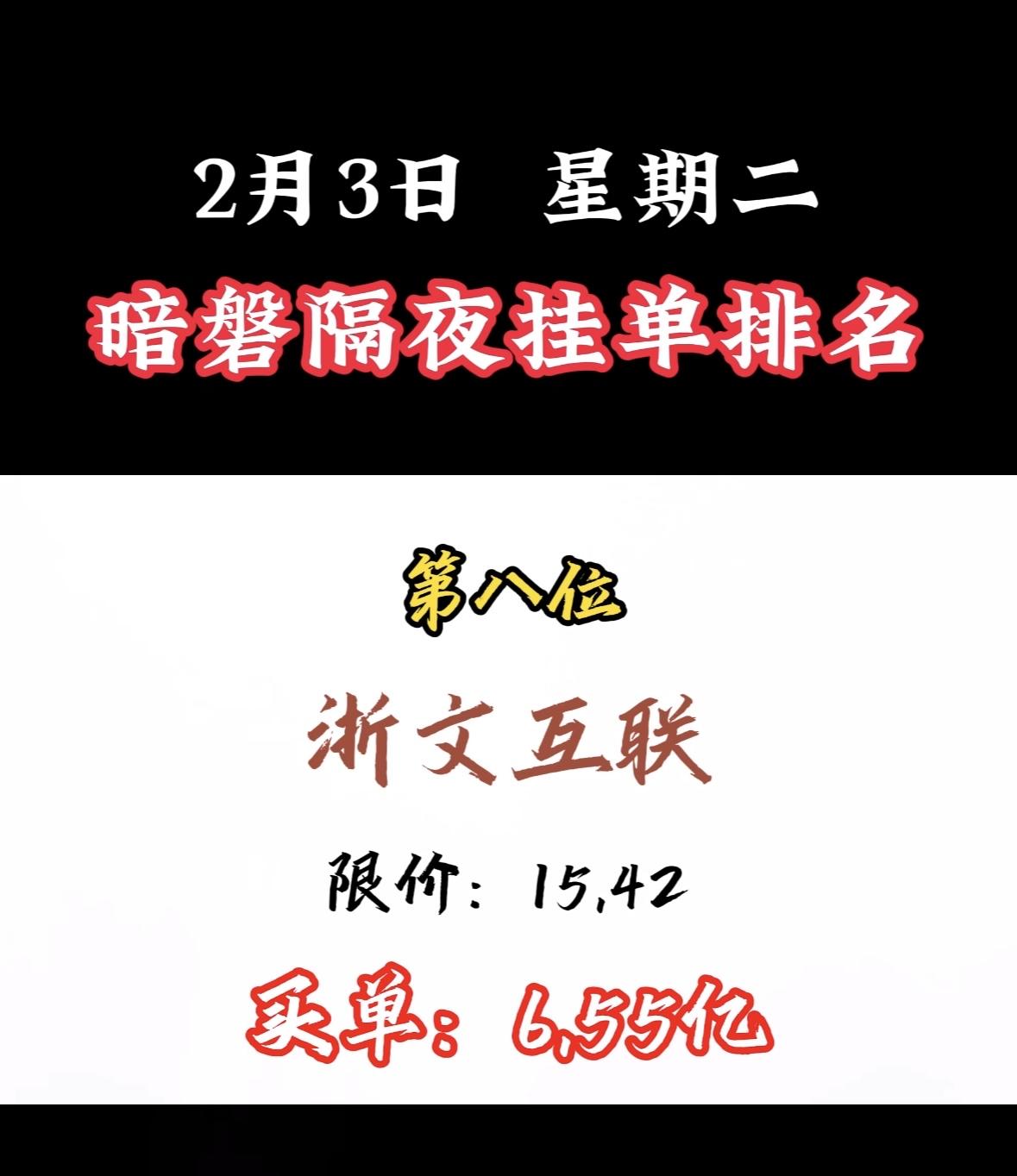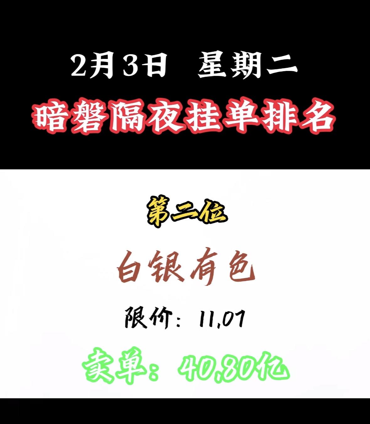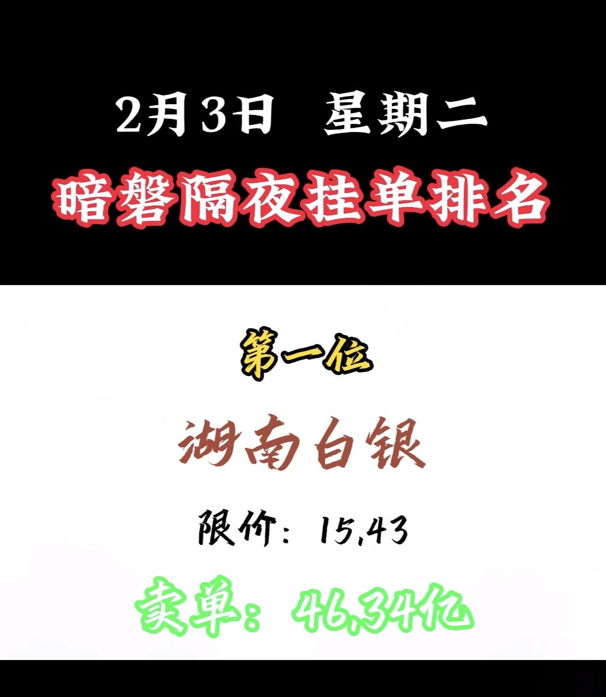 2月3日暗磐隔夜挂单排名出炉,湖南白银以46.34亿领跑! "周二暗盘浙文买单活跃,限价吸引资金关注,市场热度攀升。"