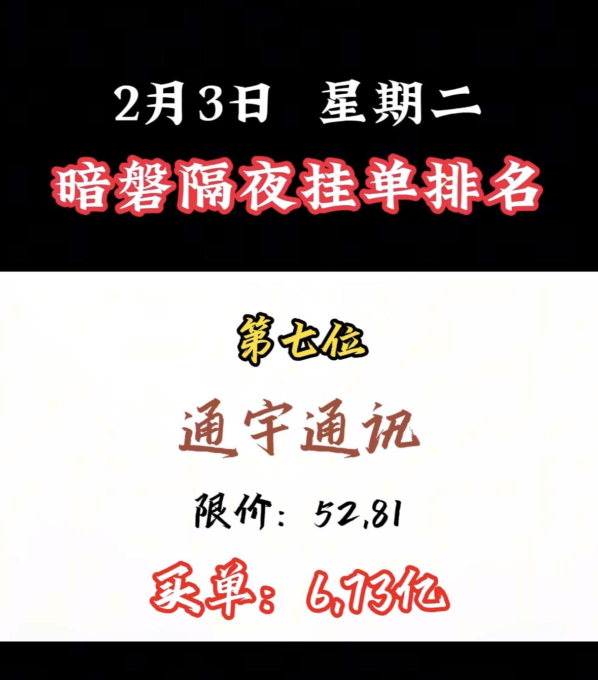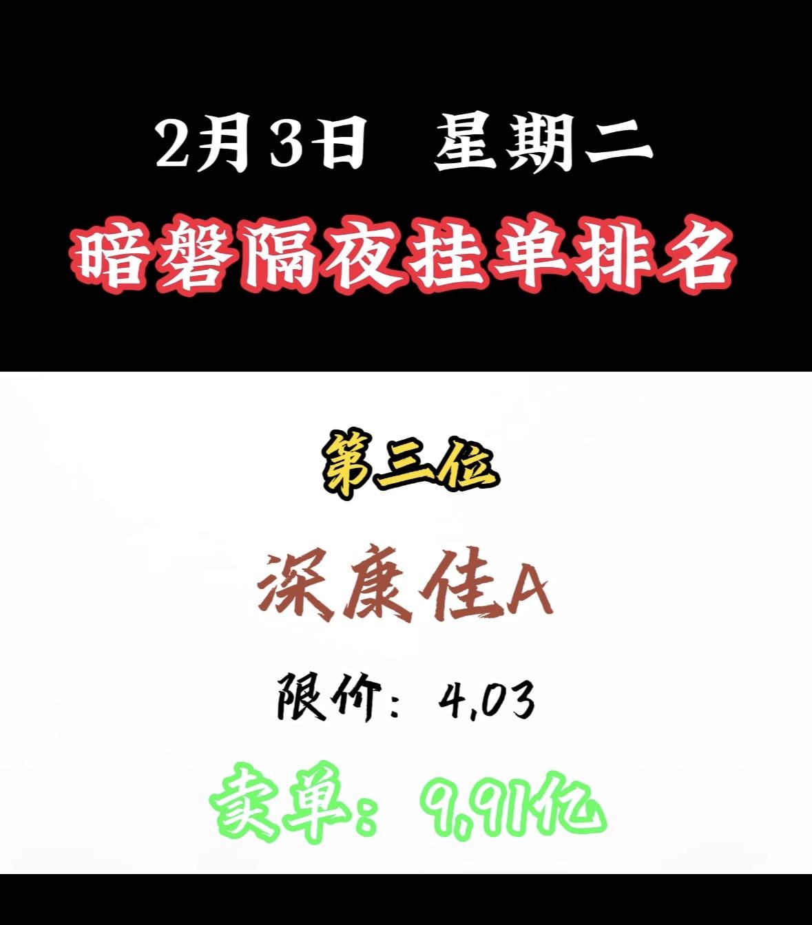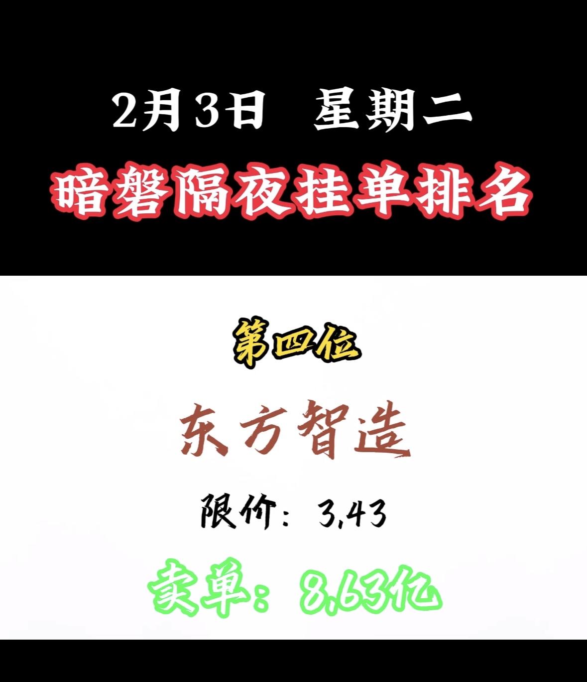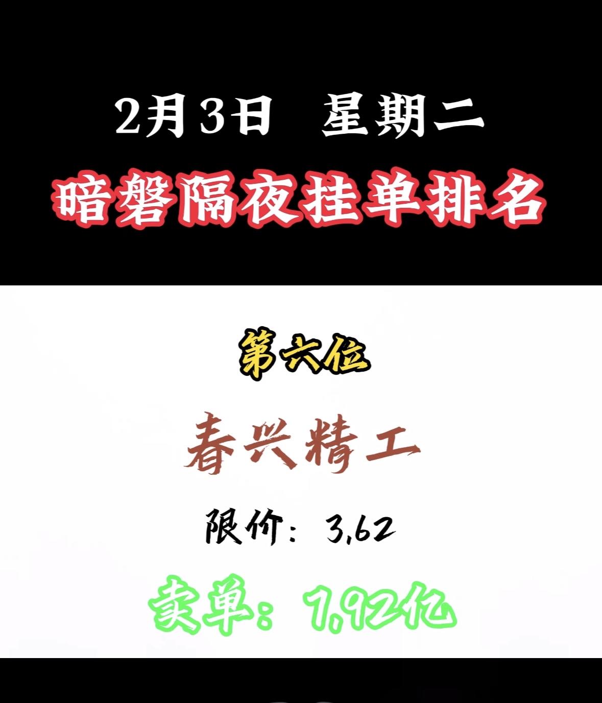 2月3日暗磐隔夜挂单排名出炉,湖南白银以46.34亿领跑! "周二暗盘浙文买单活跃,限价吸引资金关注,市场热度攀升。"