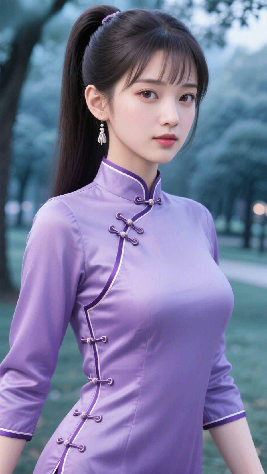 《紫襟裹晨岚》 晨雾漫过林径,她立在那里时,一身淡紫旗袍像把晨间的轻软气息织作了衣。 盘扣的细碎光泽随耳饰轻摇,马尾束着风的温软,并无刻意姿态,只是眉眼舒展时,便将东方的雅意晕得平和。 原来温婉的美从非拘谨模样,是有人往那里一站,便成了眼底轻暖的光。 淡紫旗袍雅 林间柔意