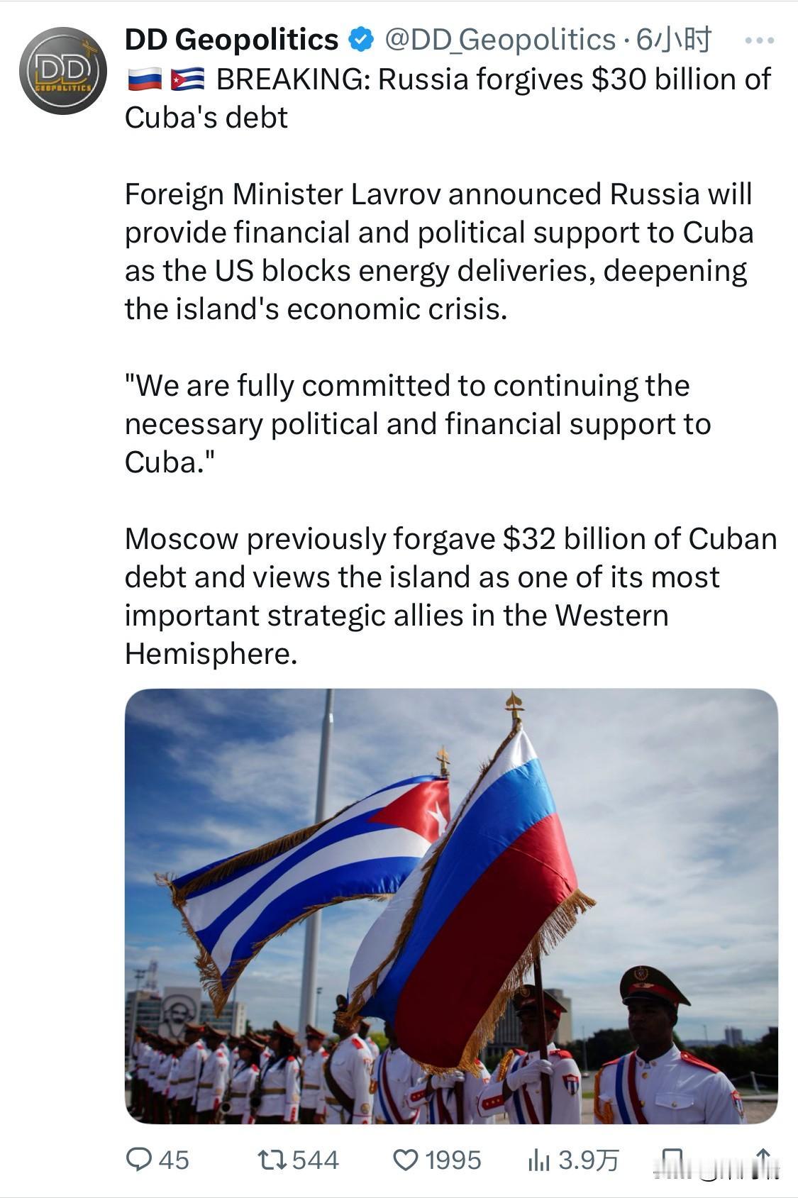 突发新闻:俄罗斯免除古巴300亿美元债务 俄罗斯外长拉夫罗夫宣布,由于美国阻止向古巴输送能源,加剧了古巴的经济危机,俄罗斯将向古巴提供财政和政治支持。 “我们完全致力于继续向古巴提供必要的政治和财政支持。” 莫斯科此前免除了古巴 320 亿美元的债务,并将古巴视为其在西半球最重要的战略盟友之一。
