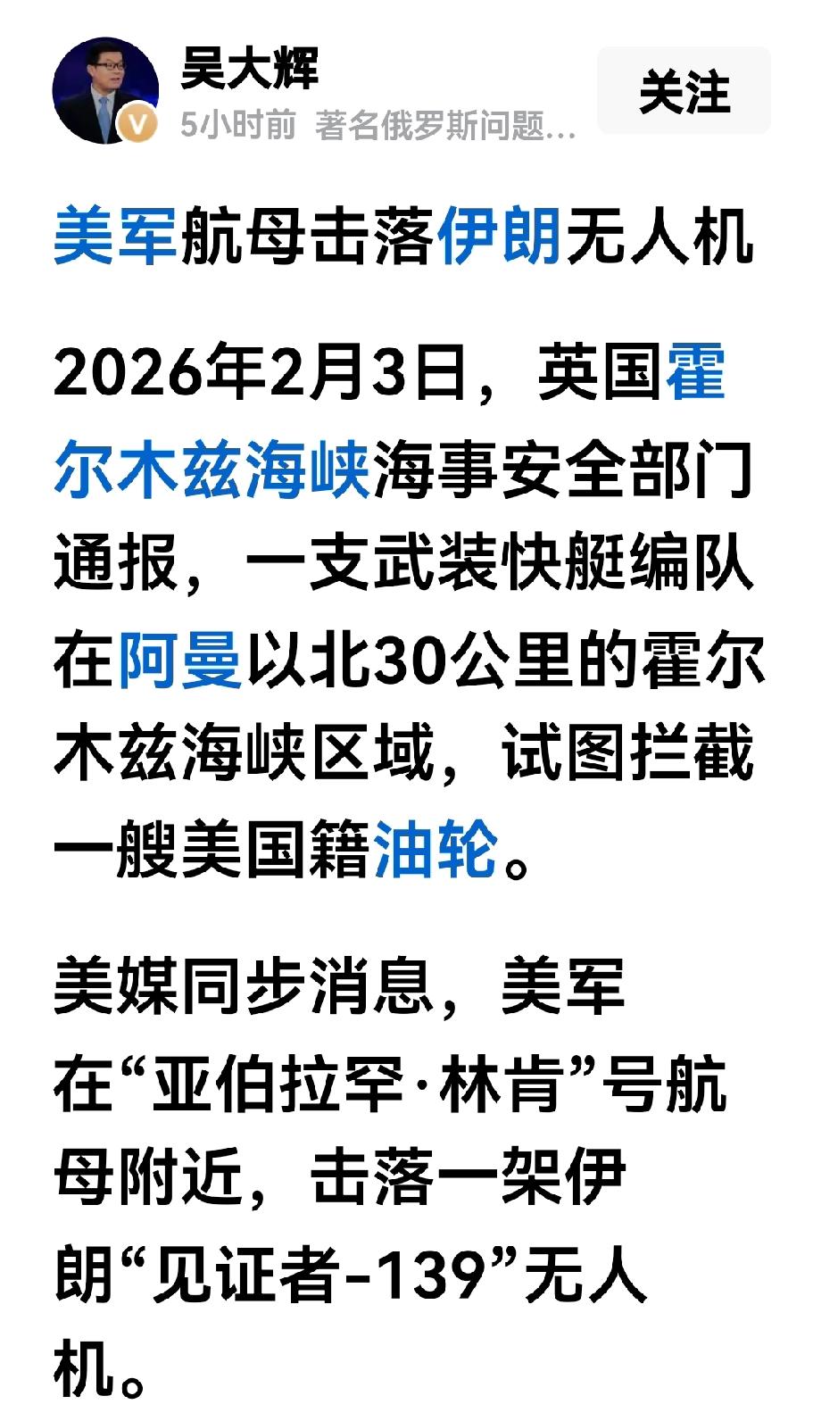 美军打响了第一枪! 伊朗的无人机被击落,这是一个好消息!伊朗就这样干,美军绝对讨不到便宜! 2月3日,一架伊朗见证者139无人侦探机在阿拉伯海被美军击落,美军的解释是,这架无人机向美航母靠近,动作非常危险! 美国大军压境,原以为伊朗军方除了被动防御,没有其他主动军事动作,现在知道了,伊朗一直有所行动,向这样的侦查行动是很有必要的。 给伊朗再献一计,听说有个大国生产有民用气艇,就是一个大气球,可以控制方向与高度,在天空中飘来飘去,而且价格非常便宜,伊朗可以大量购买,再装上摄像头,作为侦察机用,这样更省费用。 那个大国的民用气艇在一次庆祝活动中用过,没想到被风一吹,吹到了美国,最后美国花了九牛二虎之力,使用F-22战机,使用三枚空空格斗弹才将其击落,这样的游戏,谁吃亏,谁烧钱?傻子也明白。 伊朗购买了空中气艇后,就打明牌,因为要过春节了,为了庆祝活动,伊朗每天举行庆祝活动,每日会向天空中放飞许多气艇进行祝贺,若飘到了阿拉伯海,伊朗就说这是风向所致。 一天几十个气艇在林肯号航母上空盘旋,美军会怎么样呢?美军击落会浪费弹药,美国不击落,美国航母的动向被人看得一清二楚,美国的大军压境就成了国际大笑话。 对付敌人要在行动中不断想办法,要让敌人睡不着觉,扰乱他的心智。 历史上曹操百万大军直逼东吴,诸葛亮的计谋中有草船借箭,有火烧赤壁,曹操百万大军最后还不是一败涂地!东吴若与曹操谈判,定会死的很惨,想出退兵良策,击退敌军才是上上之策! 有许多贴子说伊朗若抵抗,将会死的很惨,这样长敌人威风,灭自己志气的话只会让伊朗一步步走向因境。 伊朗的实力其实一点也不弱,伊朗无人机及导弹,特别是弹道导弹,除了三个大国外,可能就是伊朗,伊的弹道导弹无论是数量还是质量、排世界前四没问题吧!伊朗还有电子战技术,绝对世界先进水平,10多年前伊朗就利用电子战捕获了美国的侦察无人机,伊朗有浑身本事,却拿出来不用,这冤枉也太了!
