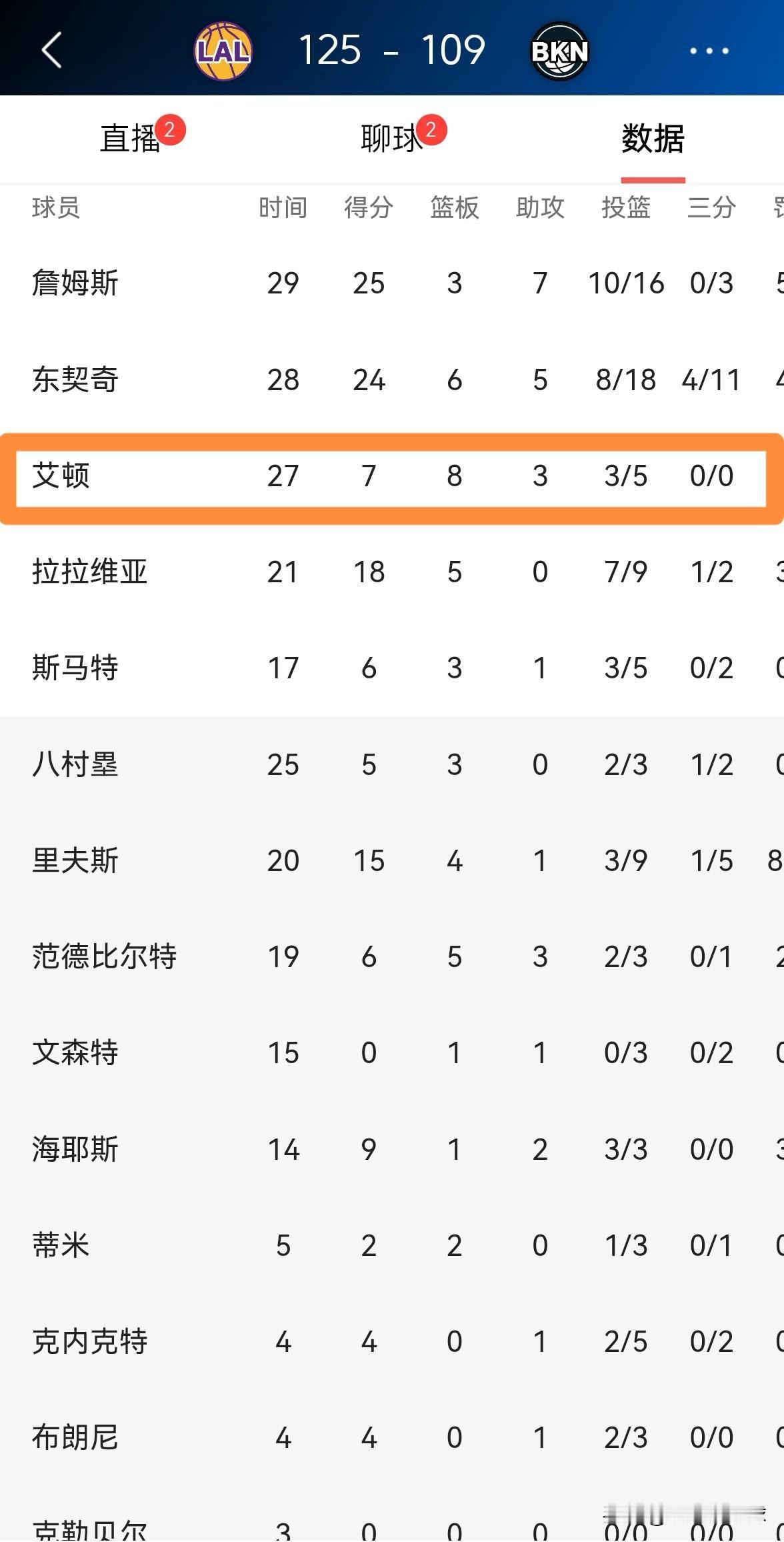 湖人当家中锋艾顿又躺赢了!在今天湖人客场以125:109大胜篮网的比赛中,艾顿仅仅首发出战27分钟,投篮5中3,其中罚球2中1得到7分8篮板3助攻1抢断,他的场上正负值为+16。 从艾顿的上场时间、出手数来看,本场比赛艾顿属于典型的躺赢,他对于球队的贡献真的非常少。