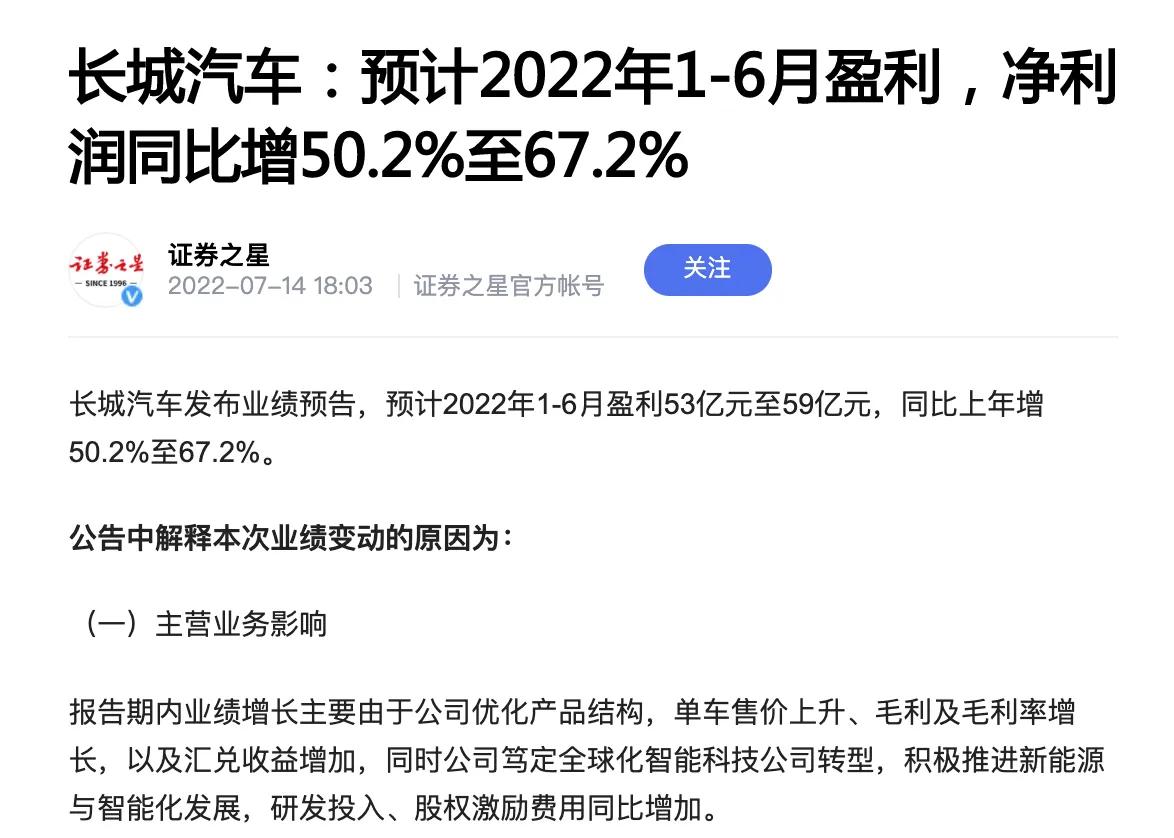 都什么年代了,还在用老一套尬黑自主品牌,不觉得有点过时了吗? 我说的就是长城汽车,最近在一些论坛中,长城汽车似乎遭遇到了一批十分有针对性的质疑,尤其是上半年的销量情况,但是我想说你们真的看懂了人家的销量报告吗? 从今年上半年的销量数据来看,长城汽车基于三大技术品牌打造的车型销售占比从2021年的57%提升至69%;智能化车型占比从2021年的74%提升至85%;20万元以上车型销售占比从2021年的10%提升至14%,更重要的是,预计2022年上半年净利润为53亿元到59亿元,同比增长50.20%到67.20%,这不比多卖几辆车更香?