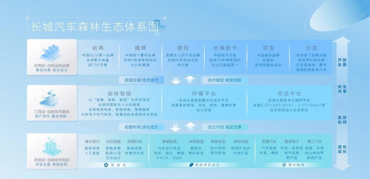 当某些品牌还在采用“拿来主义”,寄希望于供应商时,长城汽车已经开始将自建供应链与核心技术掌握在手了。 凭借多年的实战经验与雄厚的研发实力,长城汽车打造了独特的“森林生态”。简单来说,就是以整车制造为主线,全面串联起智能化(如智能座舱、自动驾驶、智慧线控底盘)、新能源(混动、纯电、氢能)和研发制造(制造工艺、动力底盘)等相关产业,让它们在长城汽车这片“森林”中开放全面、共生共享、高效协同、进化成长。这也解释了这些年长城汽车为何“爆款”频出,同时也推出了动力电池、电驱动、柠檬混动、氢能燃料电池、自动驾驶计算平台 IDC 3.0 等一系列高精尖技术。从森林生态也可以看出,长城汽车的“功力”有多么深厚。