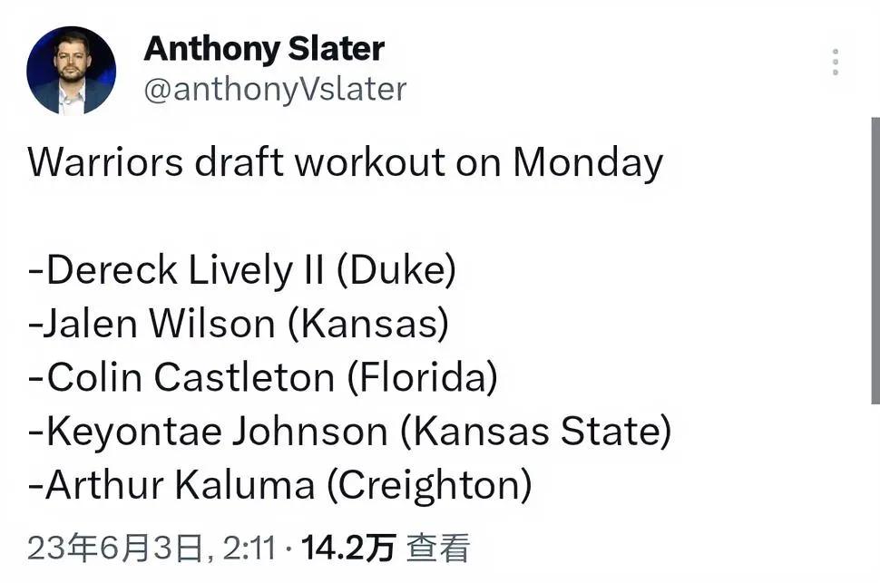 勇士新赛季的征程正式拉开帷幕: 下周二,勇士将对以下几位球员选秀试训: Dereck Lively II(杜克) Jalen Wilson(堪萨斯) Colin Castleton(佛罗里达州) Keyontae Johnson(堪萨斯州) Arthur Kaluma(克赖顿) 希望勇士今年选秀能够选一个优秀的内线球员[祈祷][祈祷][祈祷]