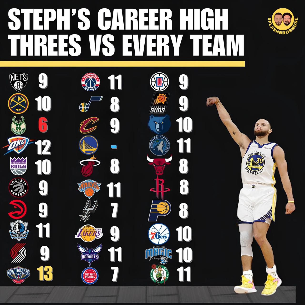 盘点库里对NBA各队的三分球单场最高记录: 最多,对阵鹈鹕,13个 最少,对阵雄鹿,6个 欢迎各位老铁点赞评论加关注[来看我][来看我][来看我]