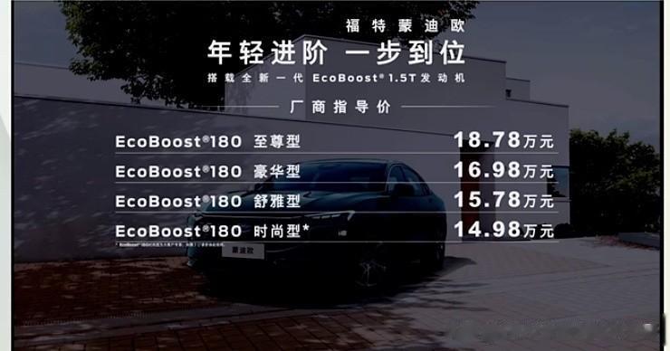 全新福特蒙迪欧1.5T车型上市,售价14.98-18.78万元,共有4款车型。看了一眼配置,如果你对大屏和驾驶辅助有需求,16.98的豪华版最合适。如果没有这些花哨功能的需求,直接入最低配就好。看看隔壁13万的迈瑞宝和508L,喜欢蒙迪欧的朋友不妨再等等