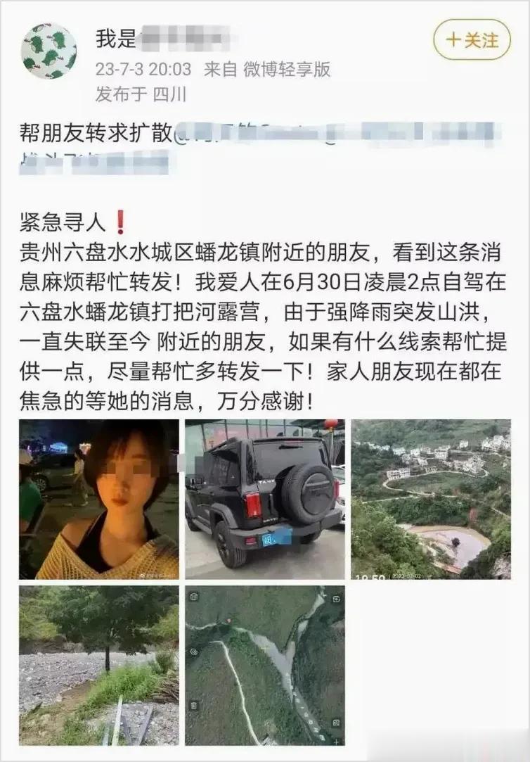 7月3日晚,一则贵州六盘水打靶河的寻人消息引发重庆广泛关注。自称帮朋友转发消息的网友称,一名姓刘的四川内江女子6月30日凌晨2点自驾在贵州六盘水市蟠龙镇打靶河露营,由于强降雨突发山洪,一直失联至今。凶多吉少。 四川女子27岁。开的是重庆越野车。好像是两个人。