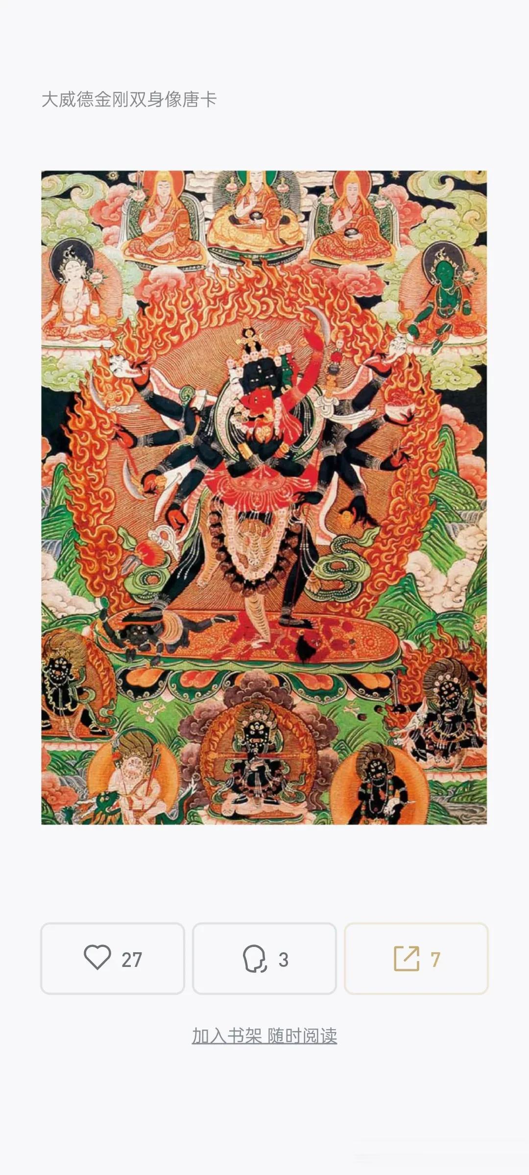 和金刚铃,代表“智慧”和“慈悲”的结合。面、臂、足显现五色变化,代表“五大”。二十四支手臂形成圆环构图。身着菩萨装与护法装的混和:头戴菩萨的摩尼宝冠,上身佩戴华丽的缨络臂钏腕镯(以上属菩萨装);下身穿虎皮裙(以上属护法装)。以展立姿站立于莲台上,脚踏印度教天神红肤欲神、白肤大自在天,两神的配偶伴跪于旁。明妃名为一切母,四面八臂二足,黄色身,以半悬姿与主尊拥抱在一起。明王和明妃彼此含情脉脉地对视,以红唇接触在一起,显示亲昵的姿态。 这幅唐卡画风单纯、细腻,可以辨认出诸多细节,例如主尊和明妃手中的各种法器。应该是藏中派作品。 密宗是印度佛教发展到晚期阶段的产物,从外在表现看,以高度组织化了的咒术、仪轨、本尊信仰崇拜等为典型特征。其实佛教中的神秘主义倾向,自从有文字记载以来就不讳言。但是密宗形成真正独立的思想体系和派别则是在大概7世纪左右,密宗的根本经典《大日经》和《金刚顶经》