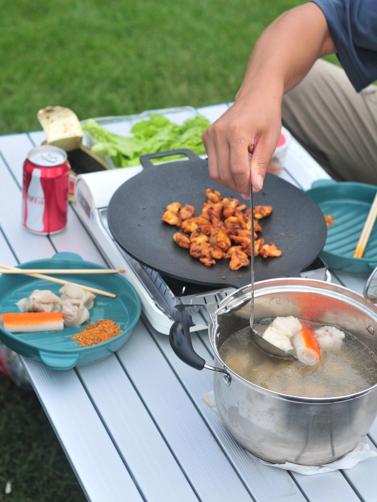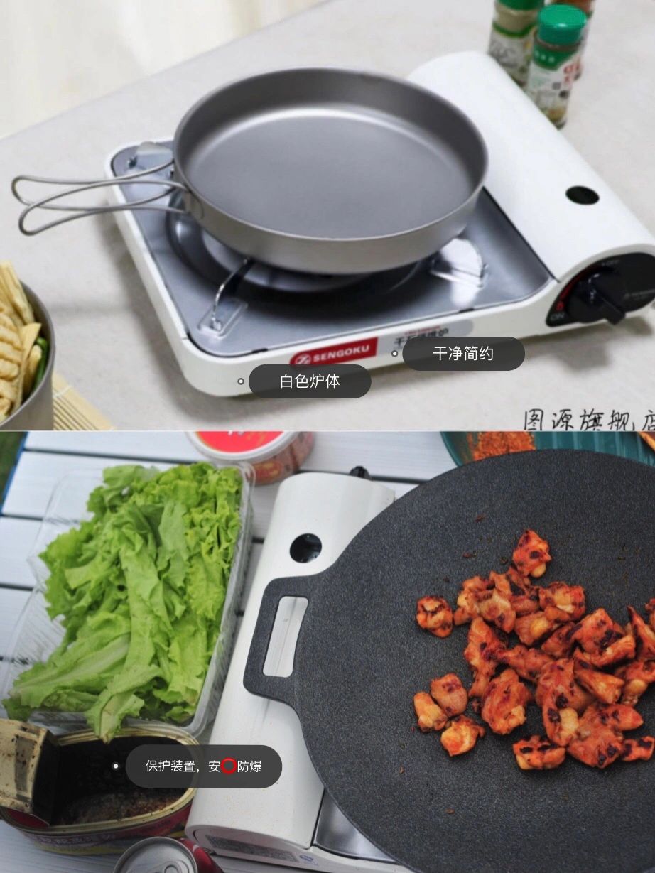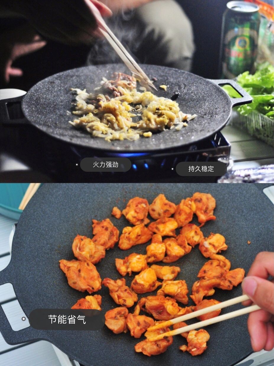 户外便携卡式炉这款卡式炉是野餐炊具很受欢迎的产品,实力和颜值俱佳!优点:1、火力强劲。3500W强劲火力,聚焦垂直向上加热,快速导热,烤肉、煮面速度很快2、持久稳定。内置导热板加速气瓶液体汽化,火力持久稳定3、安防爆。气瓶防爆;卡式炉自带过压保护装置,当遇到过高温度、摆放不平、气瓶气压不足、气瓶安装不当时保护装置会自动启动,限制卡式炉燃烧;磁吸式阀门气瓶装取方便安4、节能省气。火力强劲稳定也不耽误节能省气,性价比5、颜值高。包装很精致严实,白色炉体干净简约缺点:1、部分地区(新疆、西藏、甘肃、青海、宁夏、内蒙古、北京、河北、海南)气瓶不发货,(但其他家也差不多,此条可以忽略不计)2、收纳体积略大,几乎无法折叠,携带不够方便使用感受:火确实大,烤肉一会儿就好了,而且带出去用挺久的配套产品1、家用铁丝烤网2、韩国吃播兴森同款onhwa不粘锅露营烤肉盘