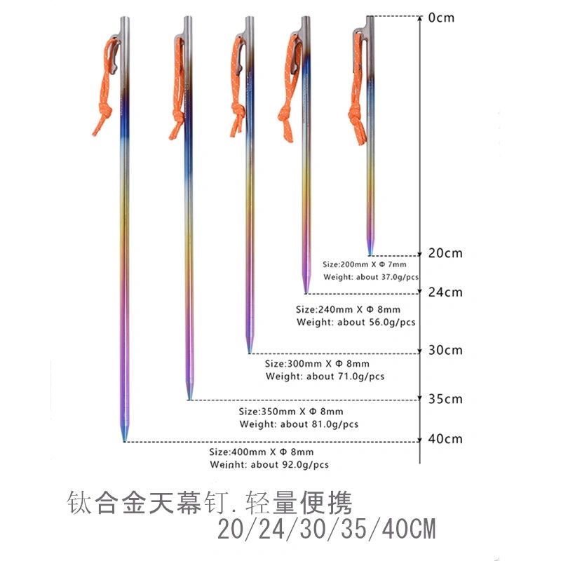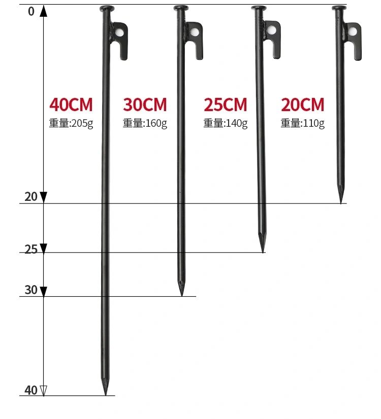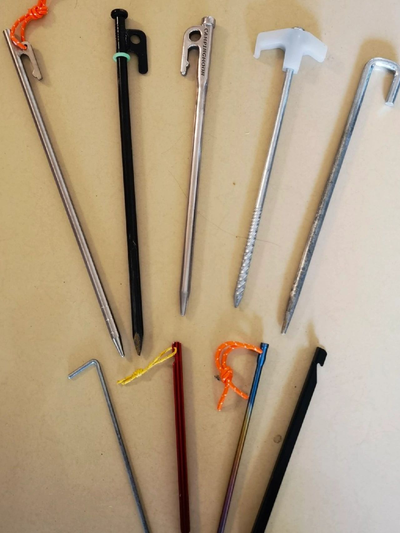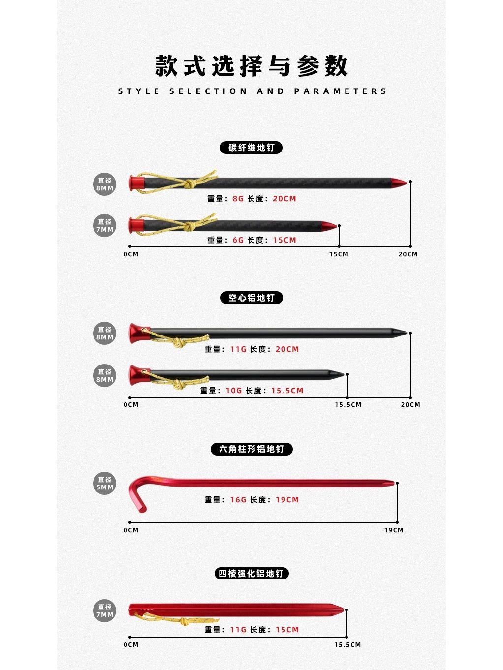 徒步露营、精致露营最优组合地钉推荐 我的几种常用地钉的整理总结。 1。抗风、石头河滩、冻土用钉(推荐单买)如果是精致露营、搬家露营图中部的黑色钢钉。很有质感强度很高,很少有弯、断的情况。长短根据装备的风阻选择,也不必所有的都换。外测风绳或者大的帐篷天幕都最好用长的这种钢钉替换。营地里24的都够用,如果是户外风大的地方选30+。 2。钛钉、碳纤维徒步用钉(推荐单买)主要是轻量化,耐用性都比较好,价格高一些。但是想想一背包的轻量化东西,钉子的价格和重量比还是超值的。钛钉是我现在用的,三峰的碳纤维(20cm,质量最轻)已经购买了,在路上。后期使用后追加评测。有关注这个的,可以关注收藏本贴。徒步时候扎营的位置很重要,如果是山上最好也用轻量化的长钉固定。特别像一些大城市因为交通原因,像斧子、刀具有可能不方便携带。这个钉子特别是长的钛钉,也可以防身或者扎鱼用。徒步我选的20+厘米的。也没必要更长的,因为轻量化的帐篷迎风面也比精致露营帐篷小。高原或者风很大的地方除外。 3。草地、土壤常规用钉帐篷、天幕基本都带的钉子,这类钉子降低成本所以长度和坚硬程度都不是很好。一般来说去营地,够用了。如果是河滩、冻土、雪地选其他钉子。平时这些钉子只要不是有风的天气固定风绳,基本都能满足要求。还有,他们都是极易消耗品。早晚得买钉子补充,买就考虑前面两种就行。 4。雪地、沙滩用钉需要做成U形,增加受力面积。沙滩、沙漠、雪地必备。这个几乎其他品种的地钉不能替代。[拔草R] 5。鱼骨钉地台、栈道、木质的地板专用。其实如果是营地,很多也提供一次性的。如果是营区或者外面的栈道,就自己准备下。我现在选择是原配钉加推荐的1和2根据出去的场景和帐篷搭配使用。