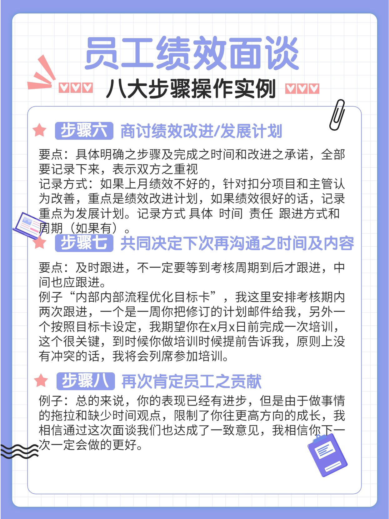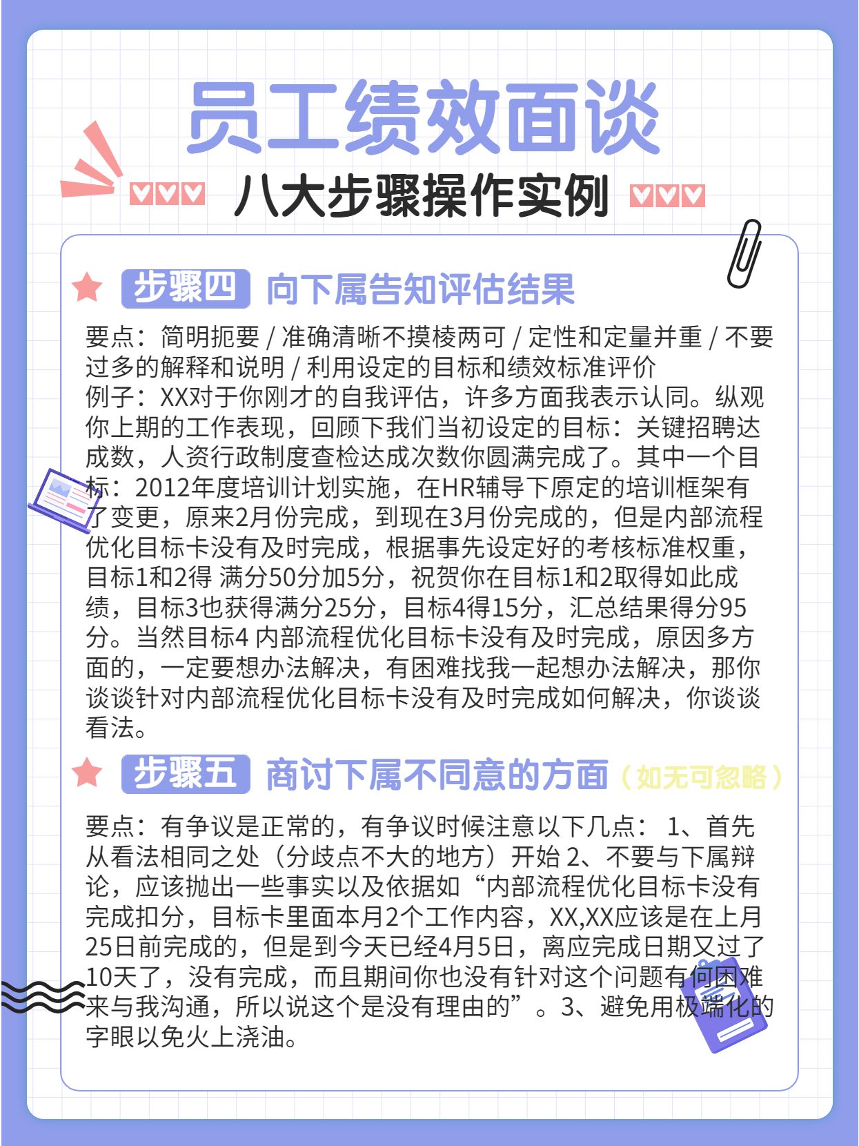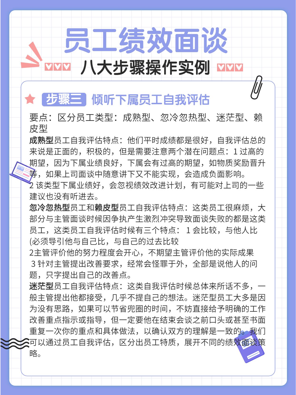 成熟型员工自我评估特点:他们平时成绩都是很好,自我评估总的来说是正面的,积极的,但是需要注意两个潜在问题点:1过高的期望,因为下属业绩良好,下属会有过高的期望,如物质奖励晋升等,如果上司面谈中随意讲下又不能实现,会造成负面影响。该类型下属业绩好,会忽视绩效改进计划,有可能对上司的一些建议也没有听进去。