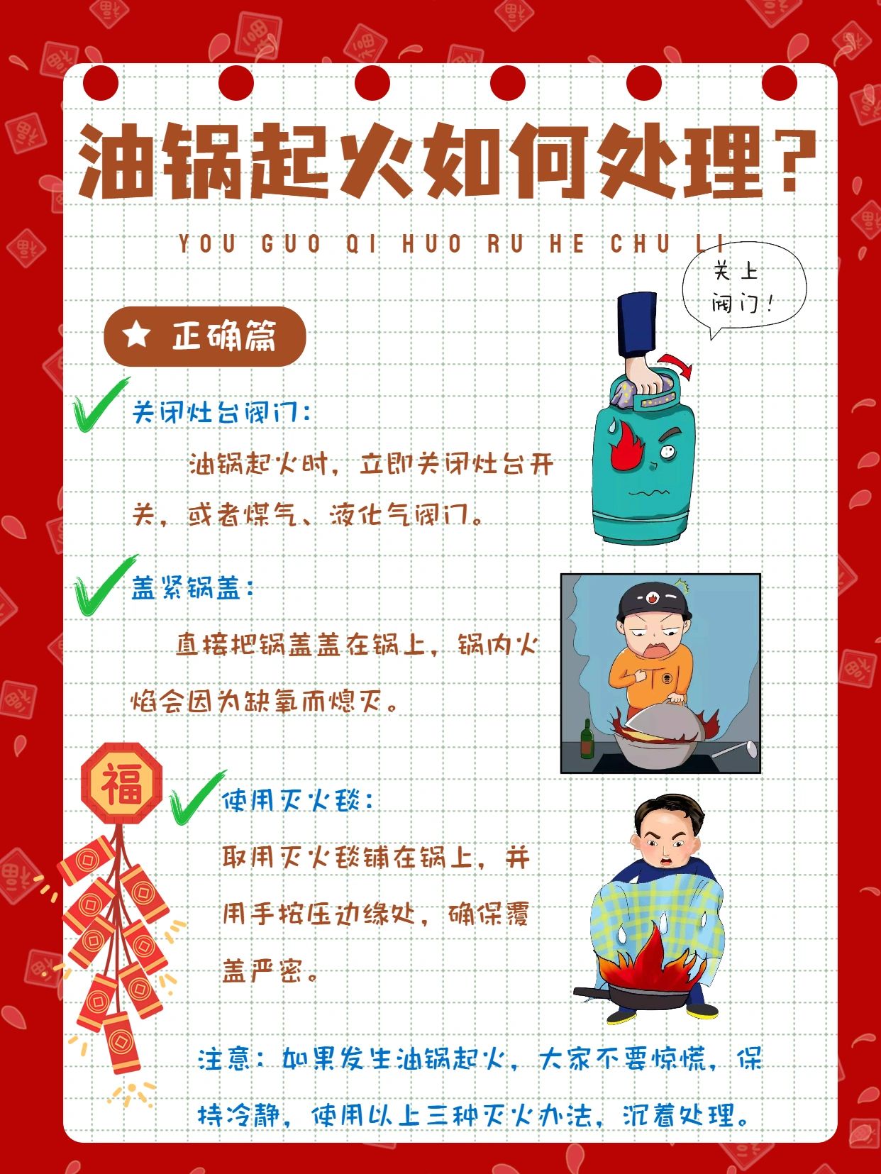 注意:如果发生油锅起火,大家不要惊慌,保持冷静,使用以上三种灭火办法,沉着处理。