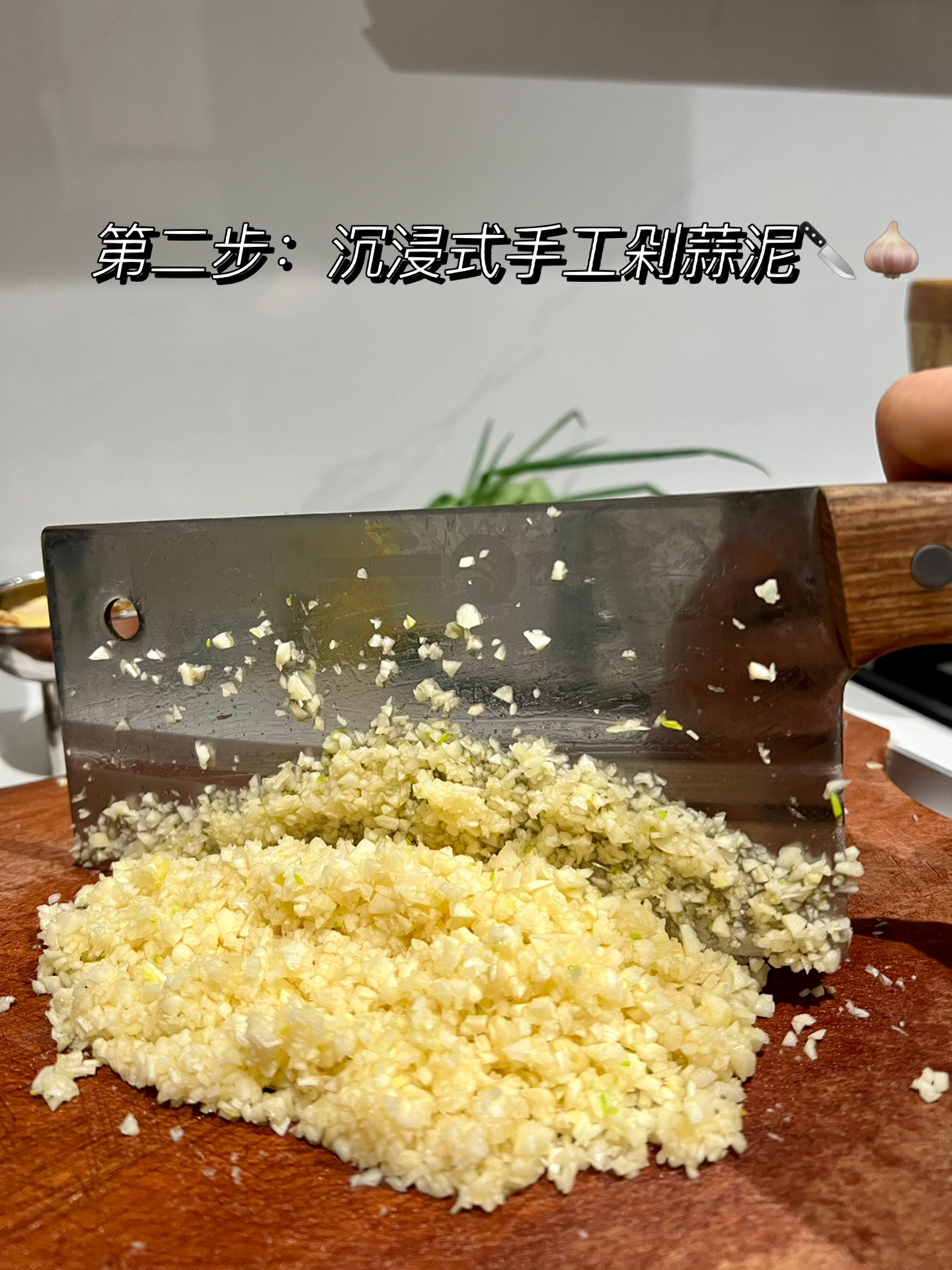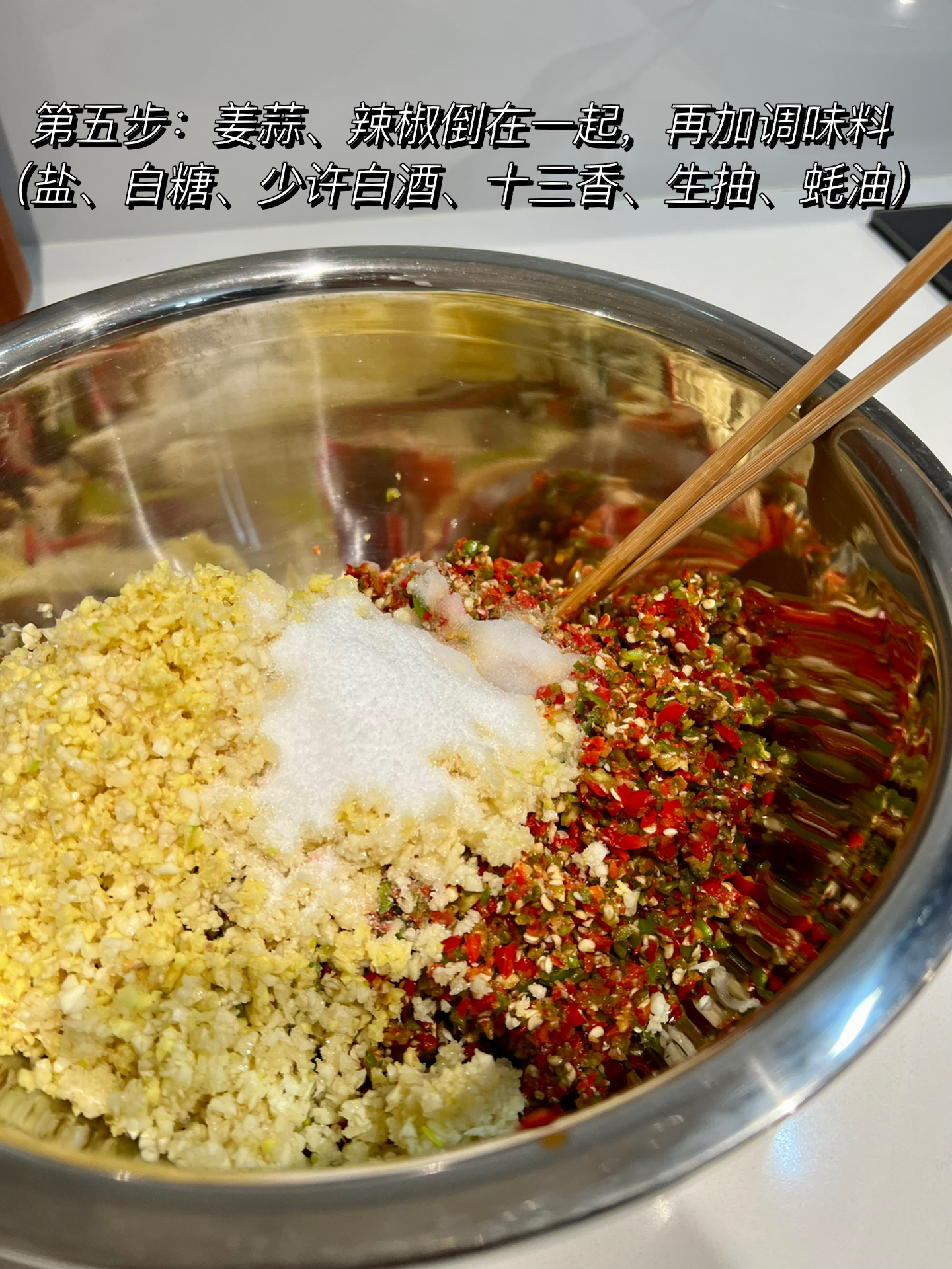 2️⃣、放盐适量,少许白糖,白酒,生抽,蚝油,剁好的蒜末姜末