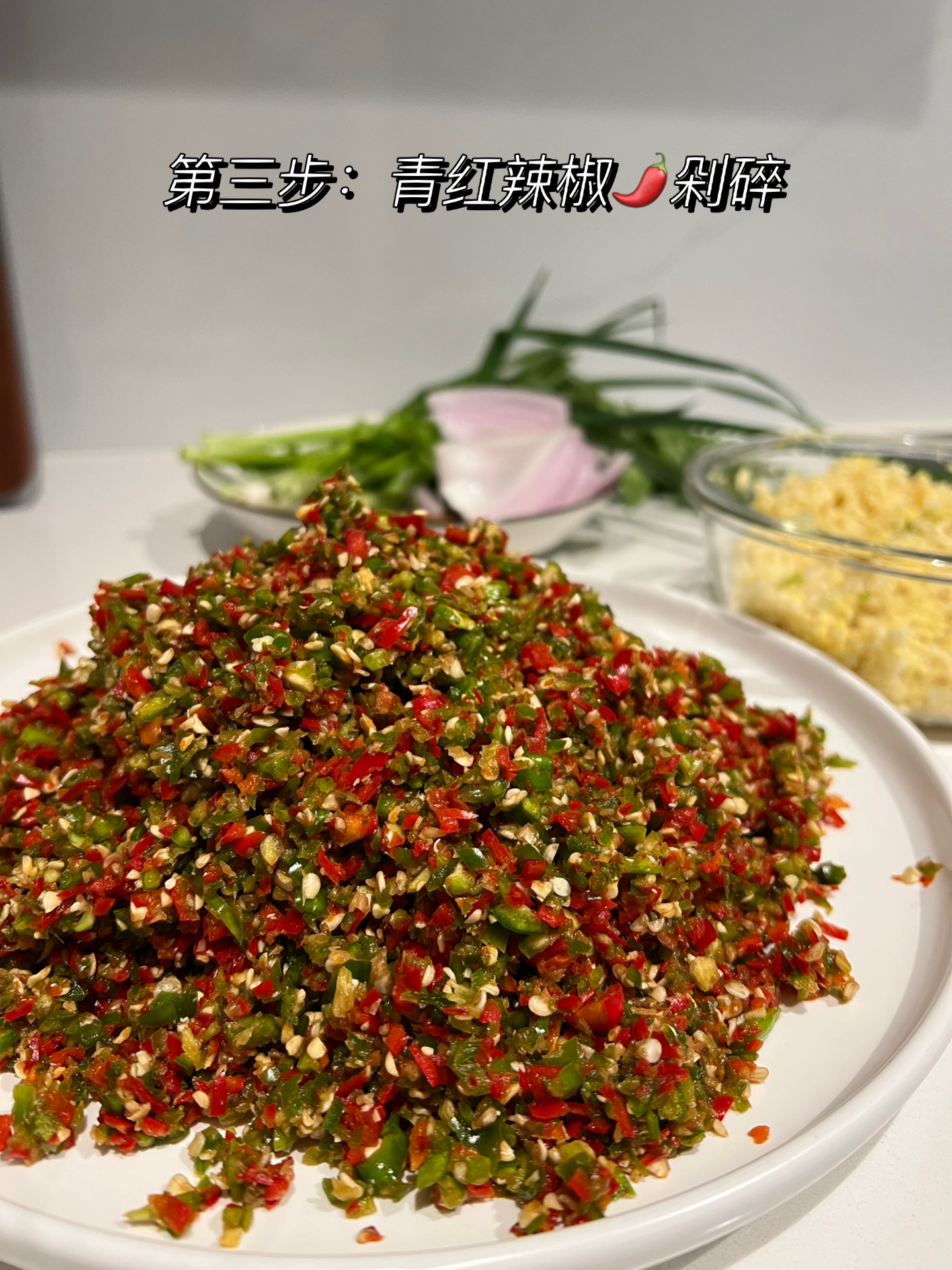 1️⃣、青红辣椒手工剁碎,有条件的可以用料理机打碎