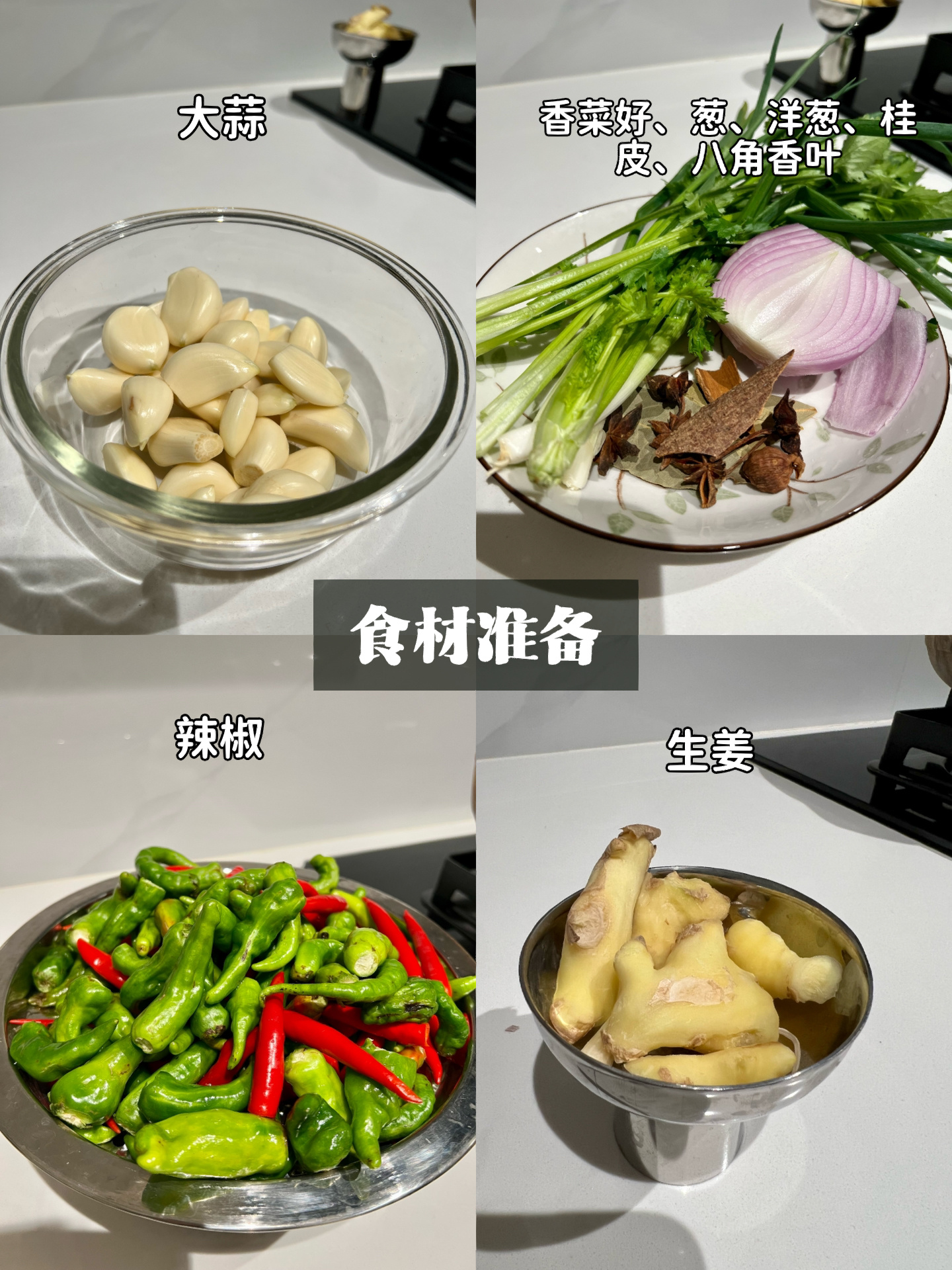 青辣椒、红辣椒、蒜瓣、生姜、小葱、洋葱、八角、桂皮、香叶、调味料等
