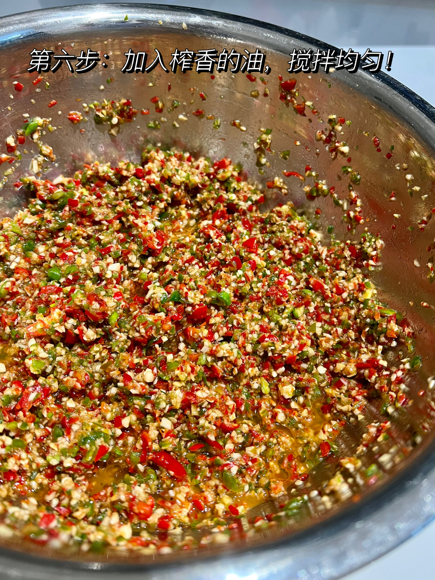 4️⃣、用热油分几次泼到准备好的辣椒料上,边泼边搅拌,喜欢清爽一点的可以少放油