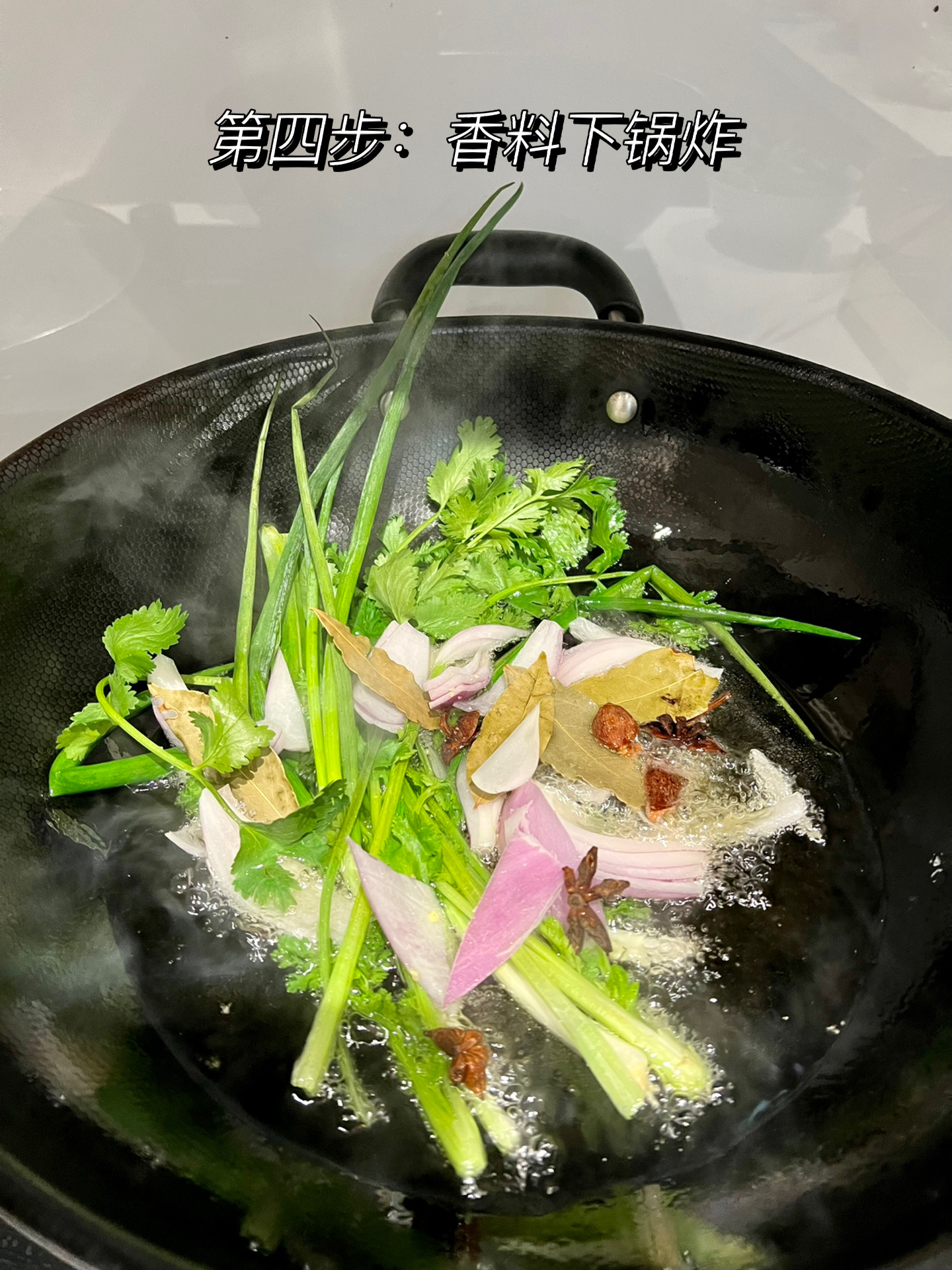 3️⃣、锅里倒油,适量放八角,桂皮,香叶,香菜,葱,姜片,洋葱等,凉油下锅,小火炸,至各种香料炸干后捞出残渣