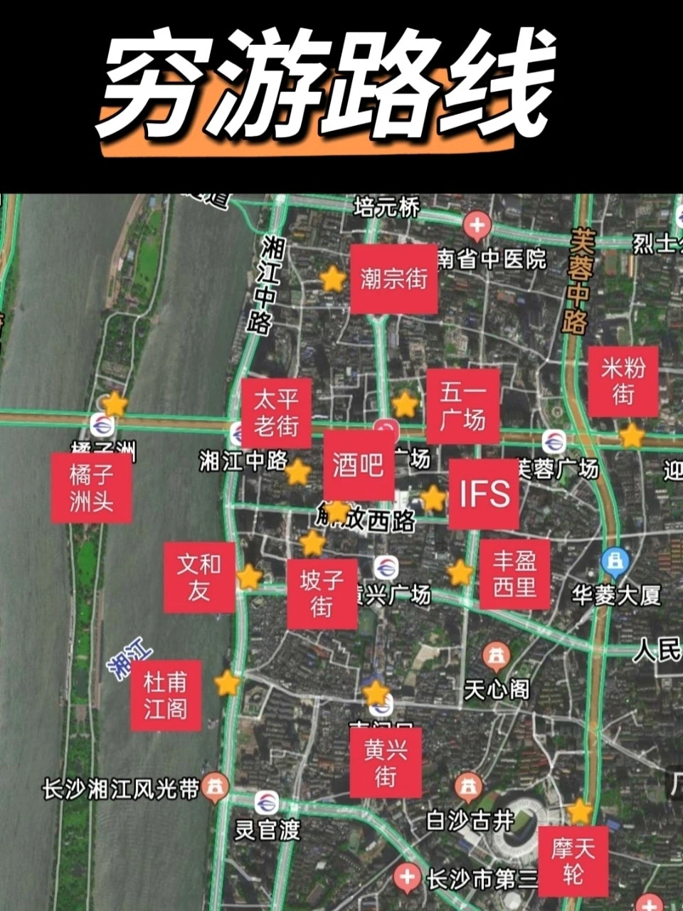 路线:🚲湖南米粉街——>🚇岳麓山——>——>🚇橘子洲——>🚲潮宗街——>🚕五一广场——>黄兴步行街——>渔人码头