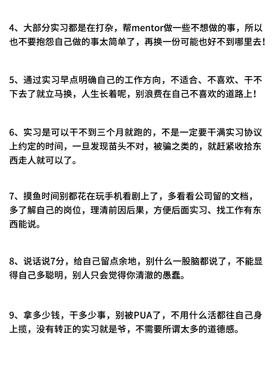 ⭕无论再多的理论知识也需要不断实践去积累经验,有好些事情只有真正的进入职场氛围才能学习到,我们一起来看下吧! 👇👇👇 ✅这些都是根据往期学姐学长们的经验总结出来的 1⃣实习不难找 2⃣大厂实习看的不仅仅是学校 3⃣找实习运气也占一部分呢 4⃣实习一定要多帮mentor做事 5⃣通过实习可以明确职业方向 6⃣一定要找靠谱实习,不要上当 7⃣在其位谋其职,在实习过程中一定要了解你到底在做什么 8⃣要明白自己只是实习生,不要越级 ✅小伙伴们赶紧学习起来吧‼