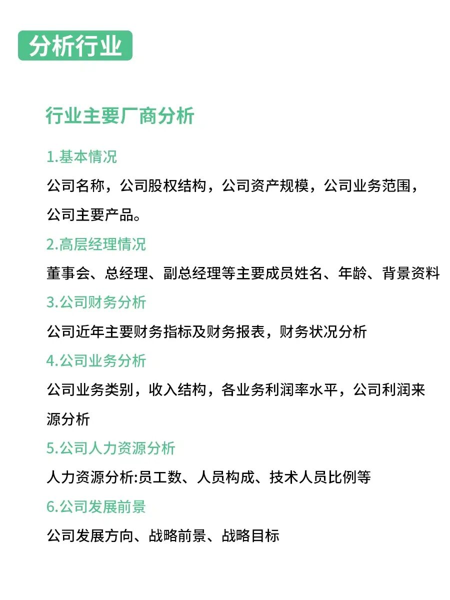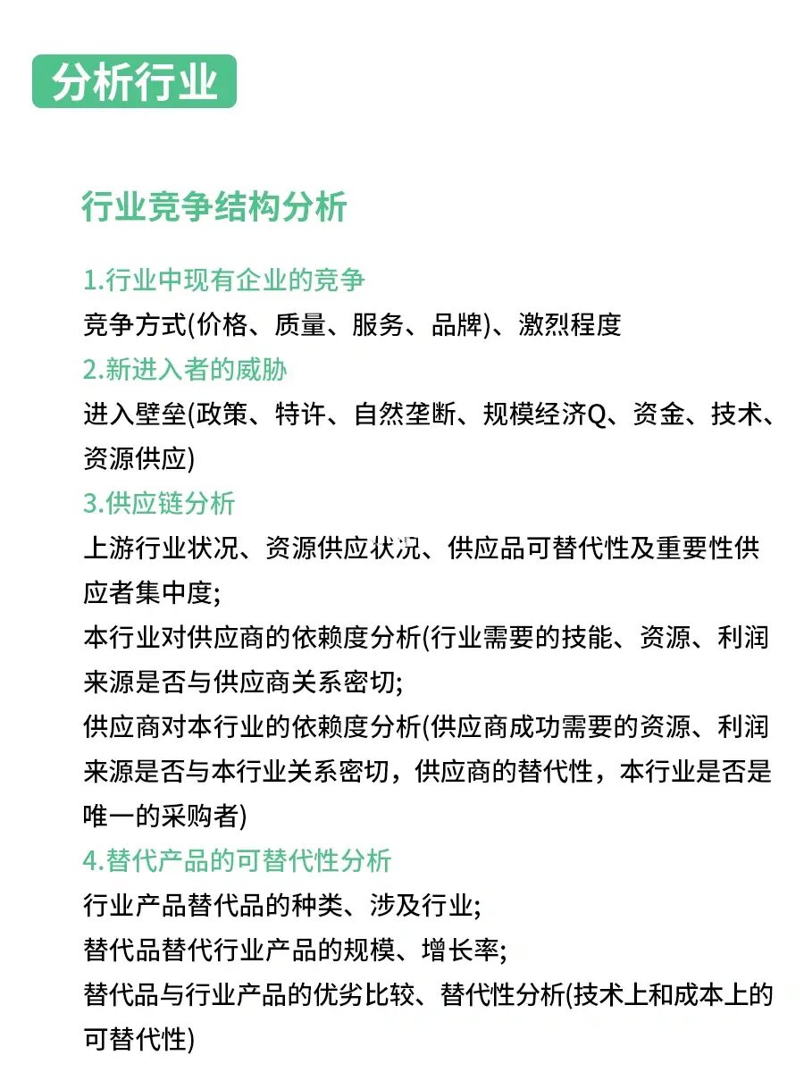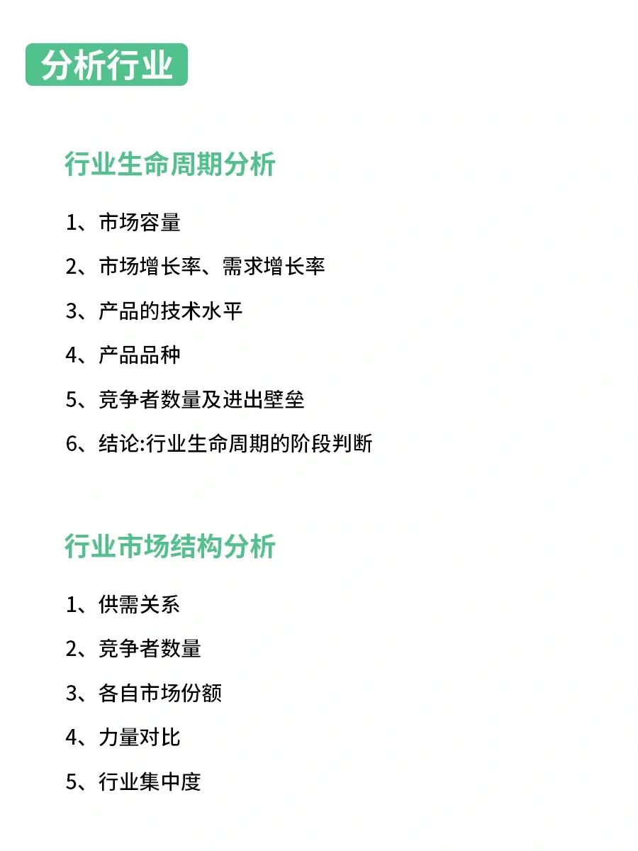 💡这里的方法论能让你对这个行业做到一周内基本完全了解,然后在此基础上去拓展深化。 👇👇👇 我们一起来看下吧 ✅这个方法论分了两大部分: ➡一、行业数据 🌈在了解一个行业前,可以看看各大咨询机构关于这个行业的分析数据 ➡二、分析行业 1⃣宏观基础 2⃣行业生命周期分析 3⃣行业市场结构分析 4⃣行业竞争结构分析 5⃣行业发展的影响因素 6⃣行业主要厂商分析 🔔赶紧码住吧‼