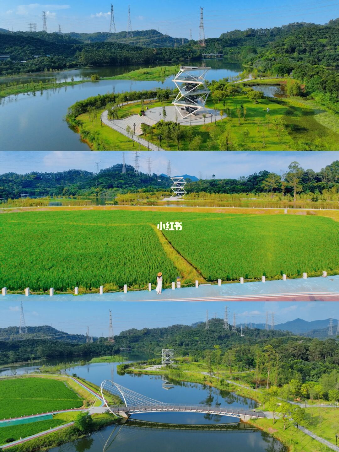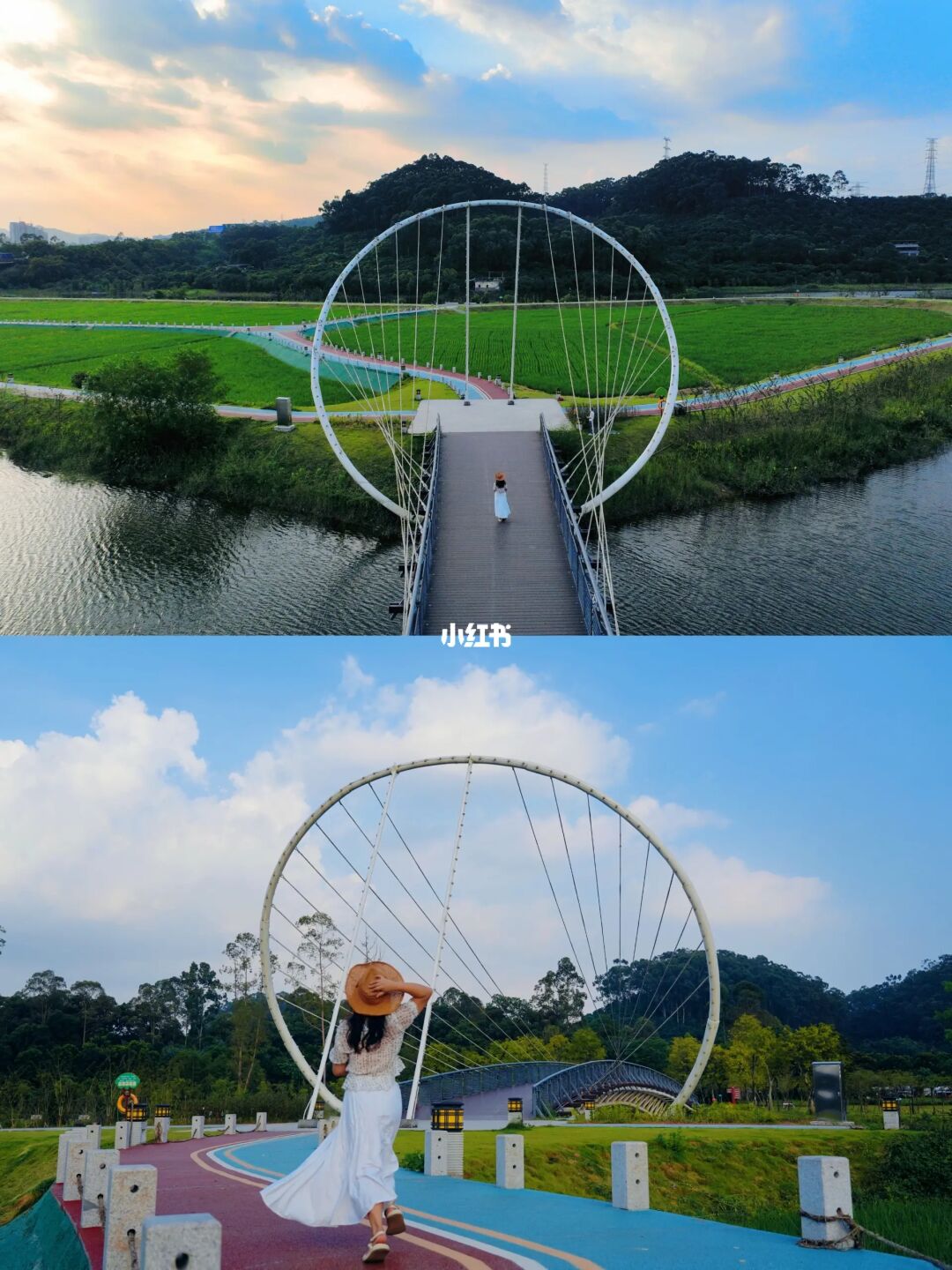 穿过环形悬索桥,湖中小岛上是一片郁郁葱葱的稻田,顺着彩色骑行道骑行一圈,心情也跟着放飞起来