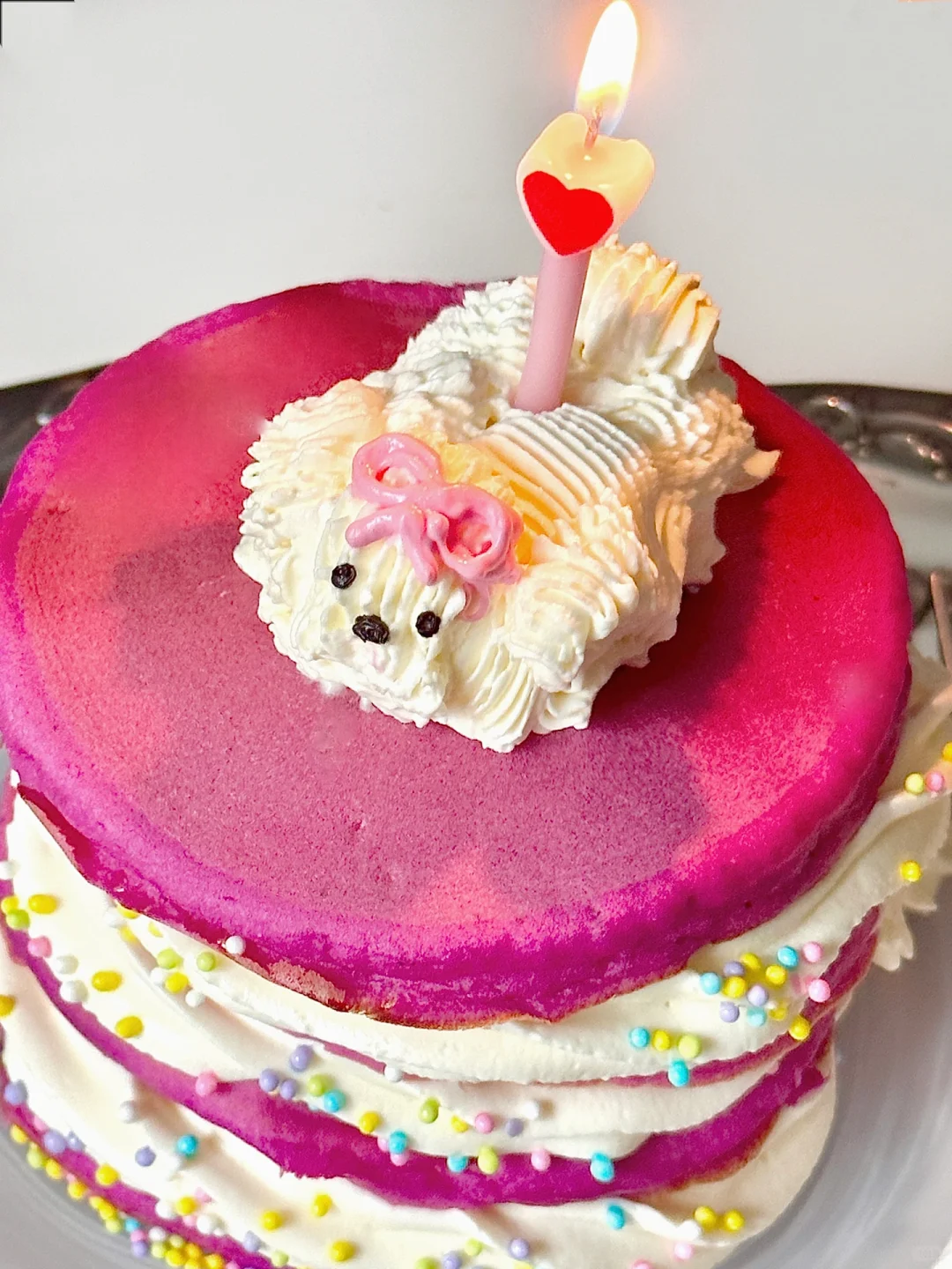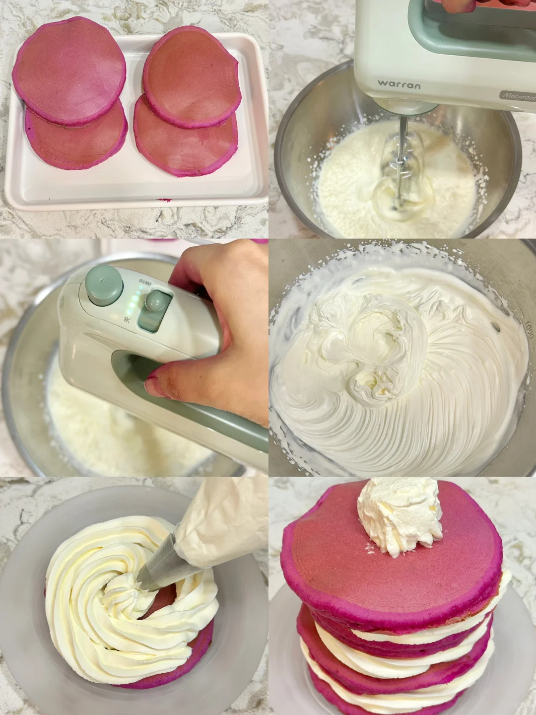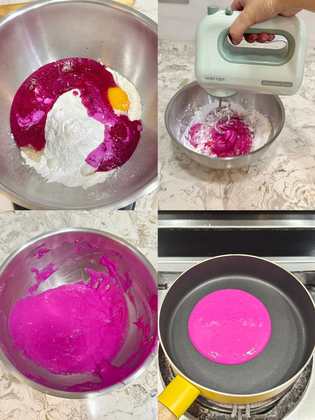 桃粉色是红龙果汁染色哒! 所需食材: 低筋面粉 100g,糖粉 30g,全蛋一个,泡打粉 3g,火龙果汁70g视情況调节,盐 0.5g 制作步骤: ①将上述材料混合为糊状装入裱花袋或者挤酱瓶 ②平底锅冷锅倒入面糊,小火煎至有大气泡翻面再煎一分钟左右就OK ③淡奶油加入适量白砂糖,几滴柠檬汁打发,六齿花嘴剂每层蛋糕之间,狗狗用SN7041裱花嘴,具体挤法参考之前狗狗薯饼或狗狗凤梨酥笔记哦[飞吻R] 快来交作业吧[萌萌哒R]