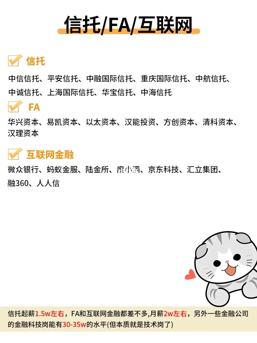 🎈这类就是校招中岗位不太多的方向,或是非传统金融公司,留学生有不错的校招offer也可考虑,大体都二三十万左右