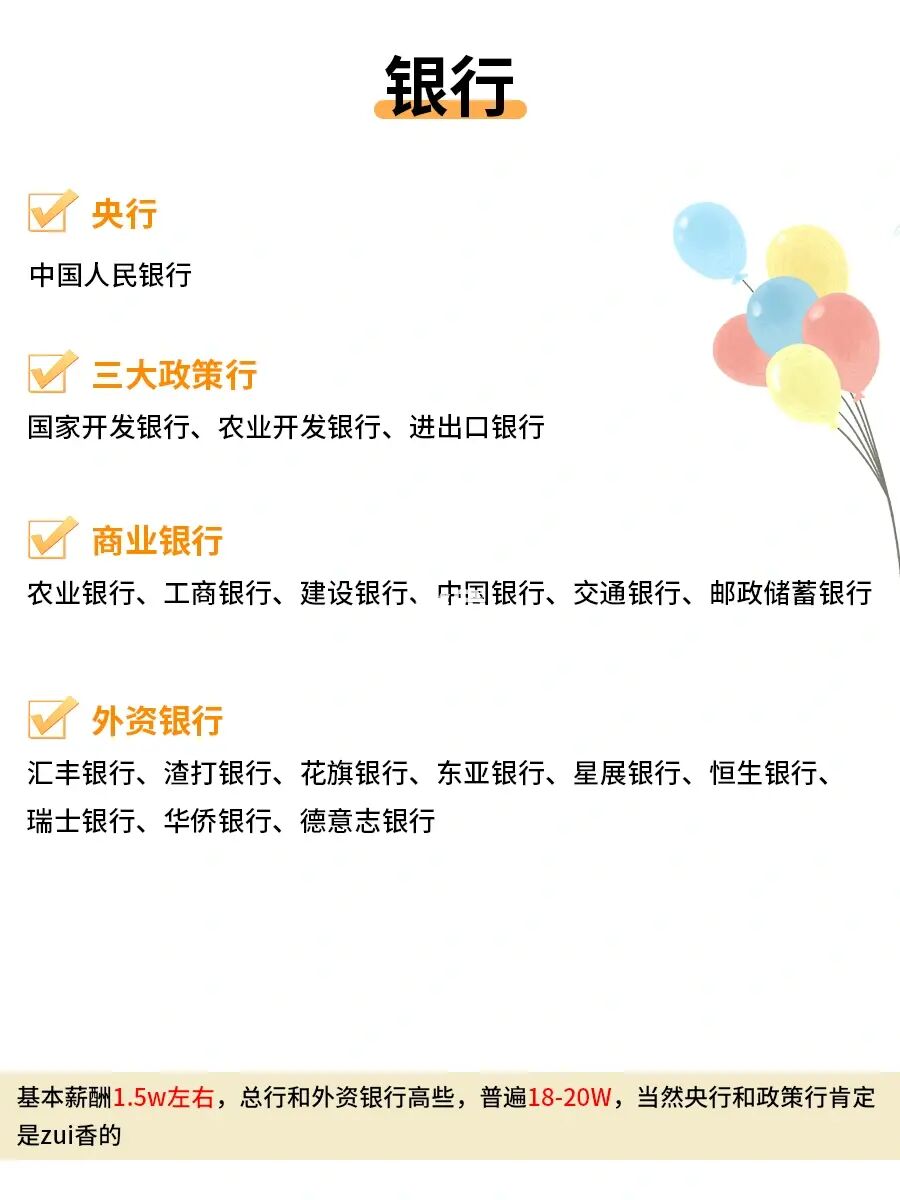 🎈应届生校招待遇:基本1.5w左右,总行和外资银行高些,普遍18-20w,当然央行和政策性银行是zui香的