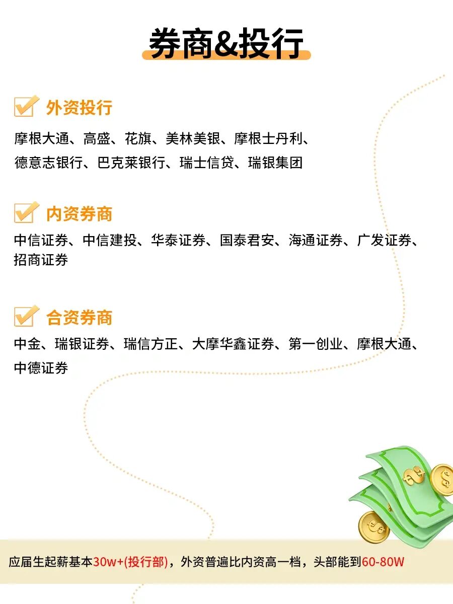 待遇:应届生起薪基本30w+(投行部),外资普遍比内资高一档,头部能到60-80w