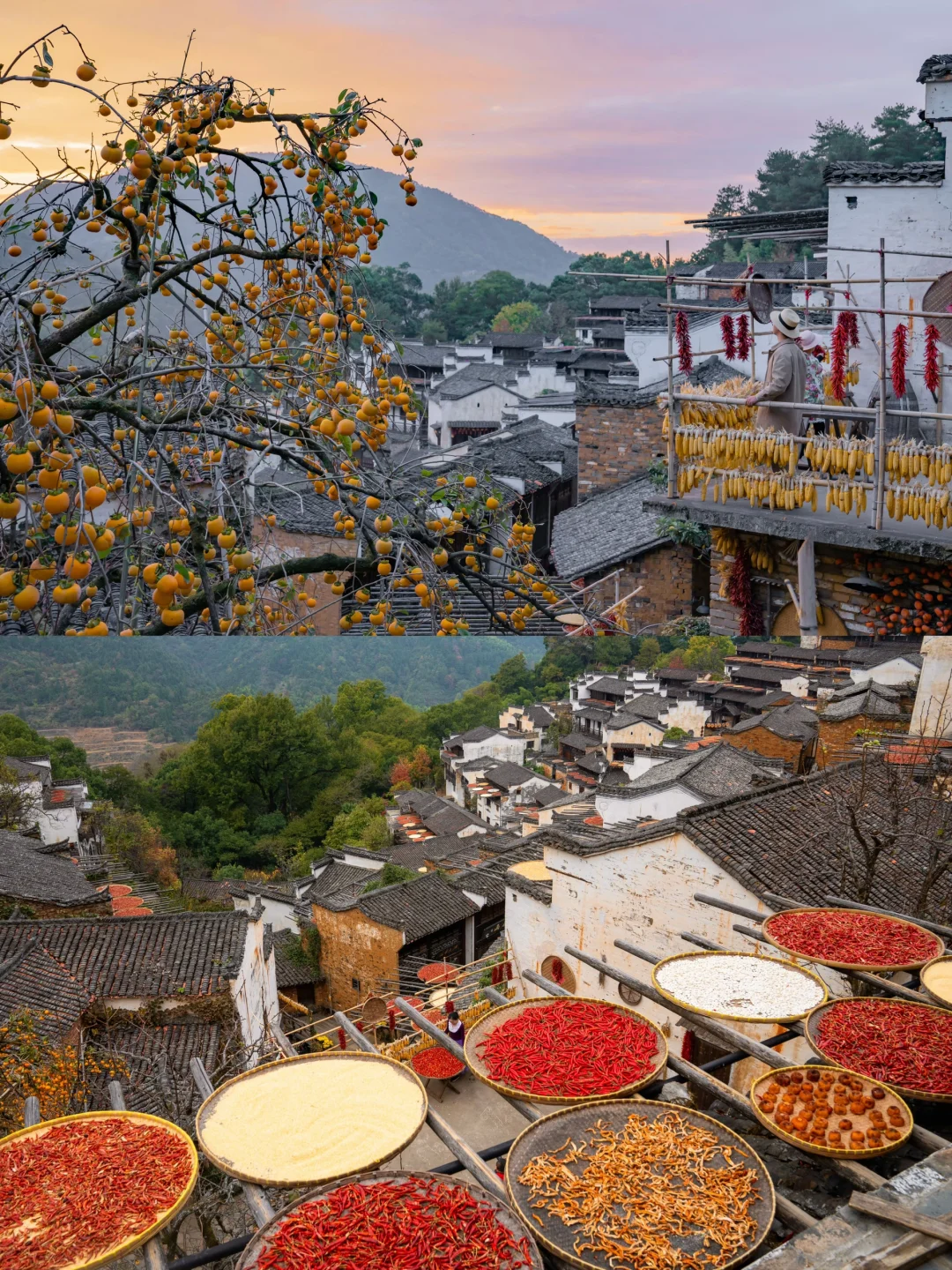 马上就到了篁岭秋季zui盛的时间,晒功坊旁的柿子树结满柿子,窗台上晒着秋天的色彩,古村zui盛的人间烟火气大概说的就是这样的场景