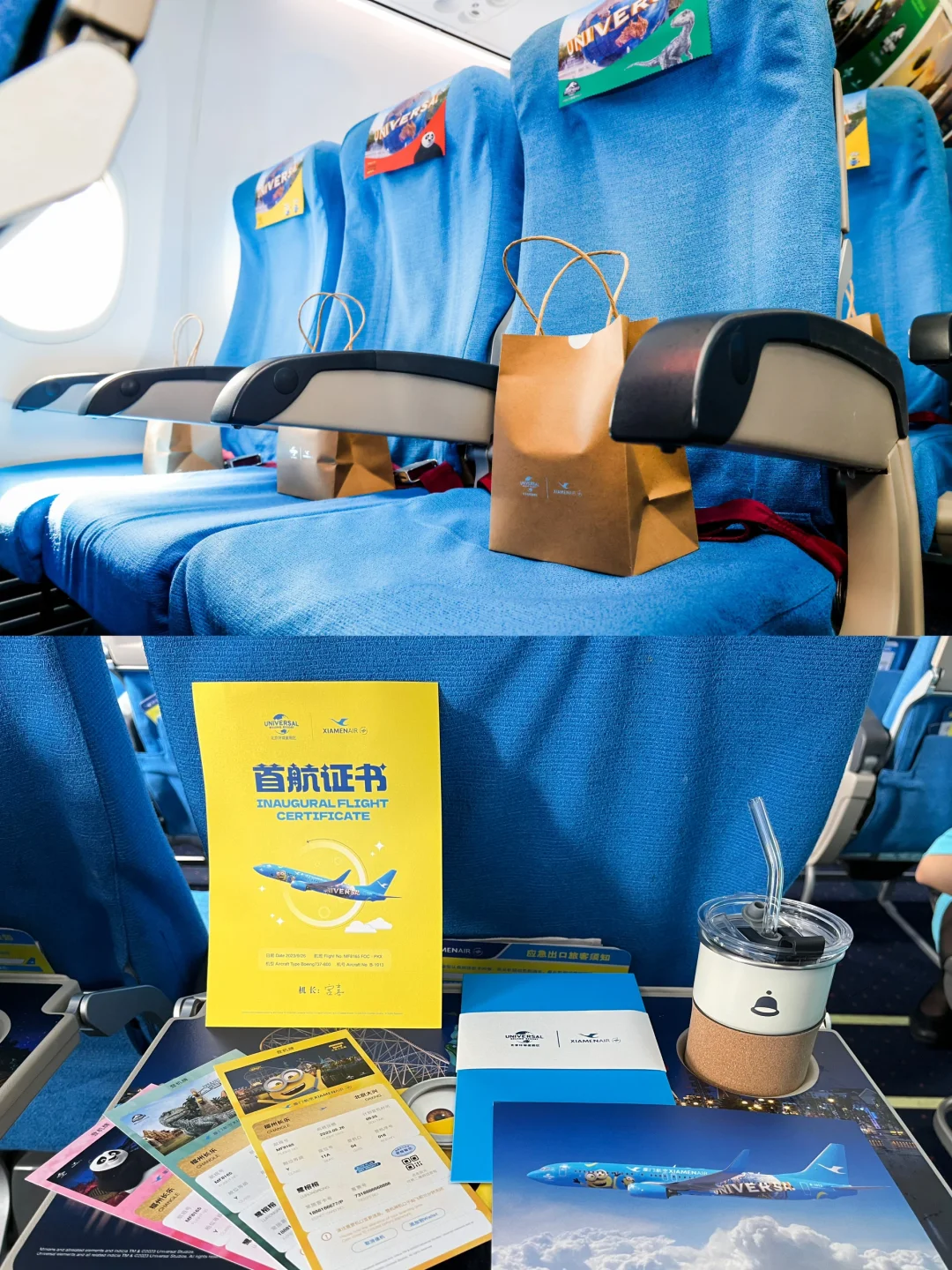 看介绍在进入机舱后就有4个不同环球ip的行李架布置,落座后就连小桌板、头枕垫、餐盒也全都做成侏罗纪世界、小黄人乐园、功夫熊猫盖世之地、哈利波特的魔法世界主题元素,像是提前进入了环球,细节真的被拿捏住了,特别适合亲子、情侣出游,我这种影迷也很心动。
