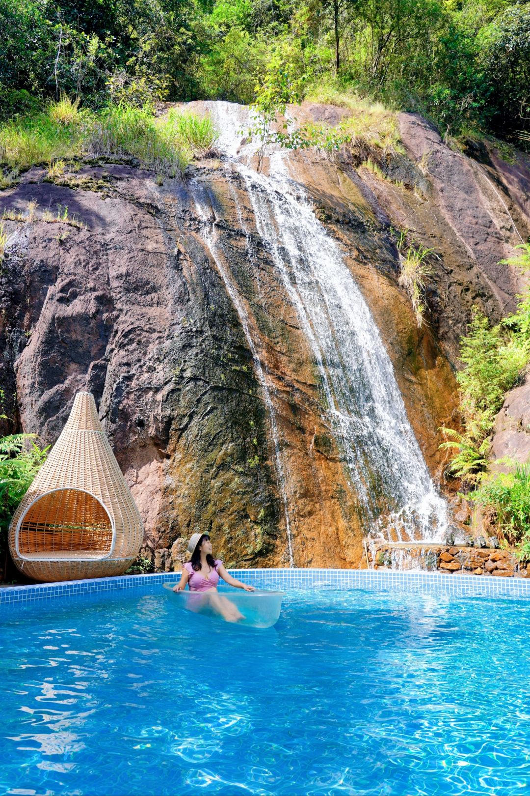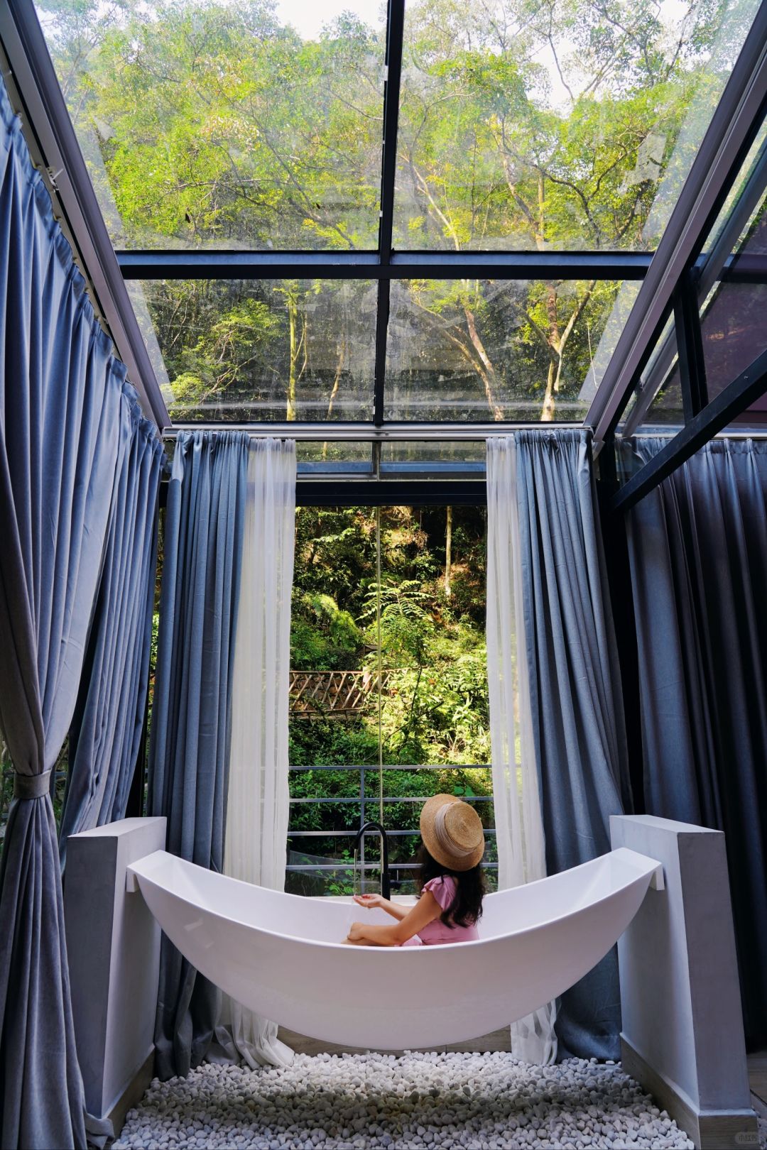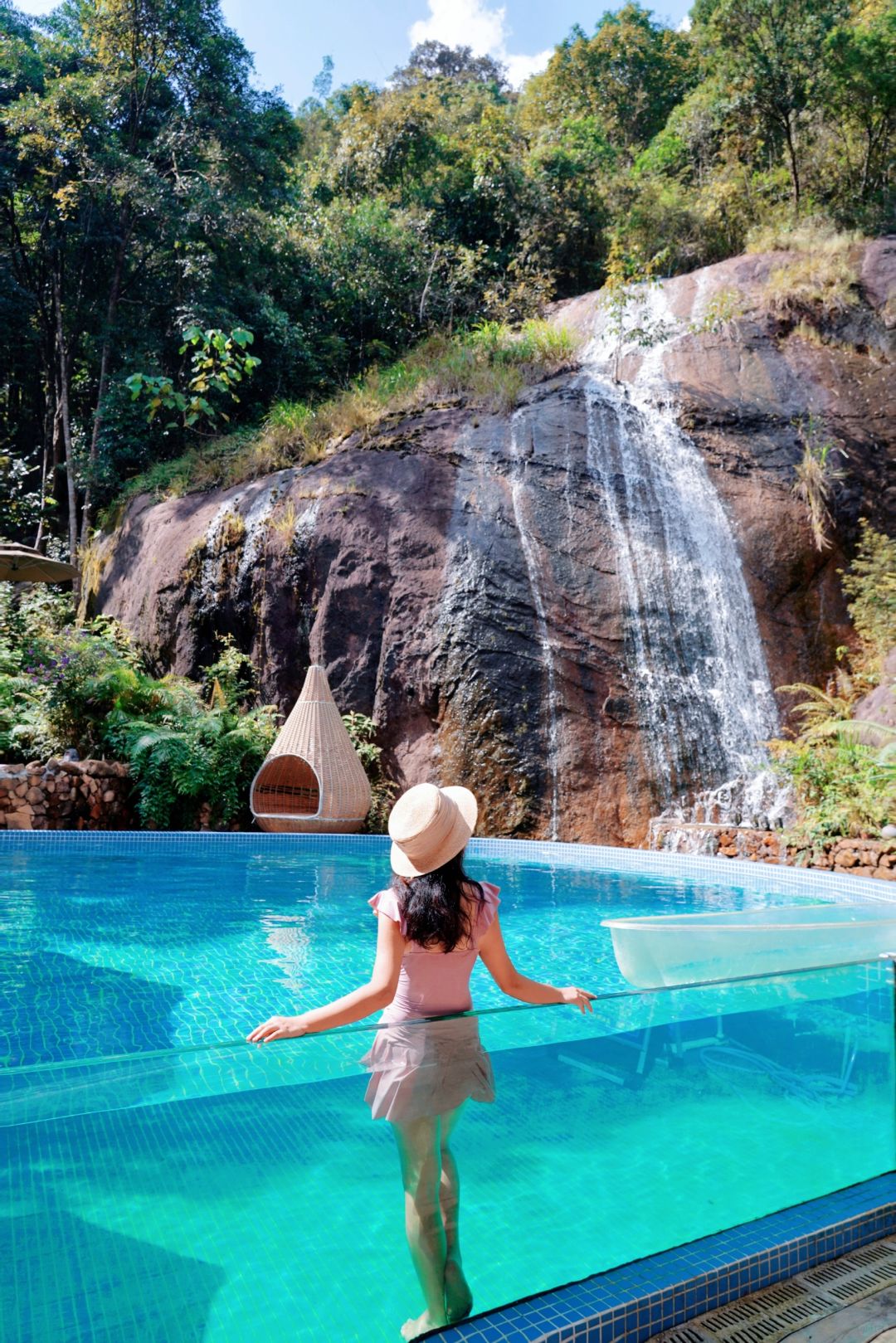 🔹 如果溯溪还不够清凉,那就直接跳入瀑布下的玻璃泳池吧!泳池里的透明船拍照更是好好看