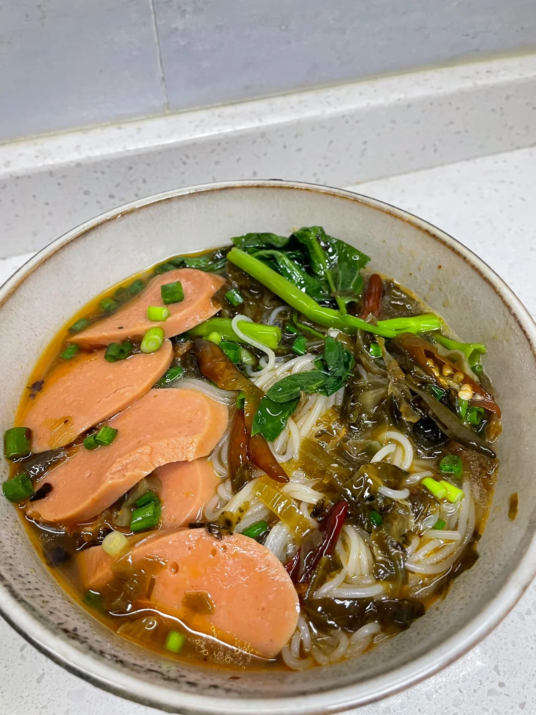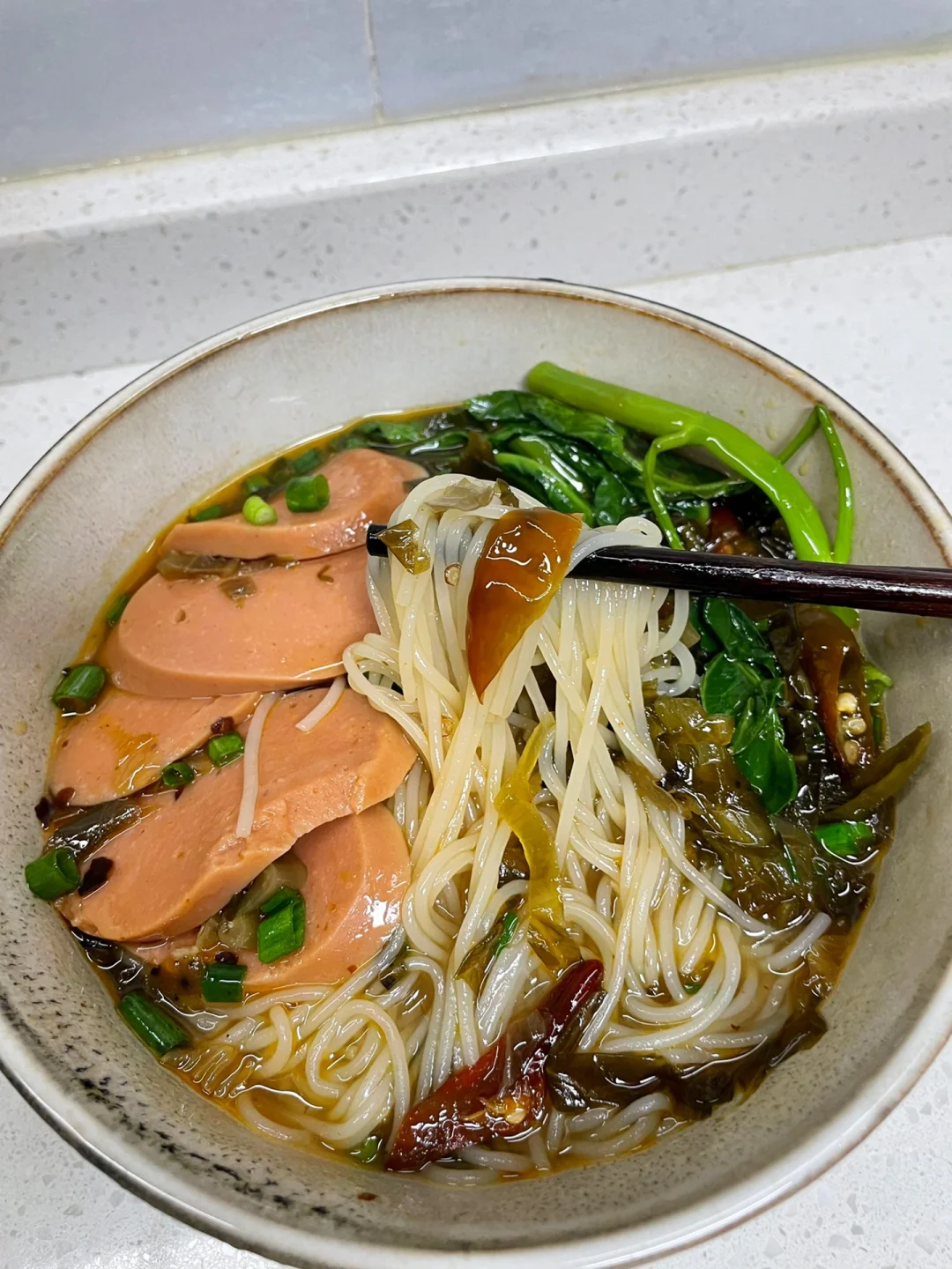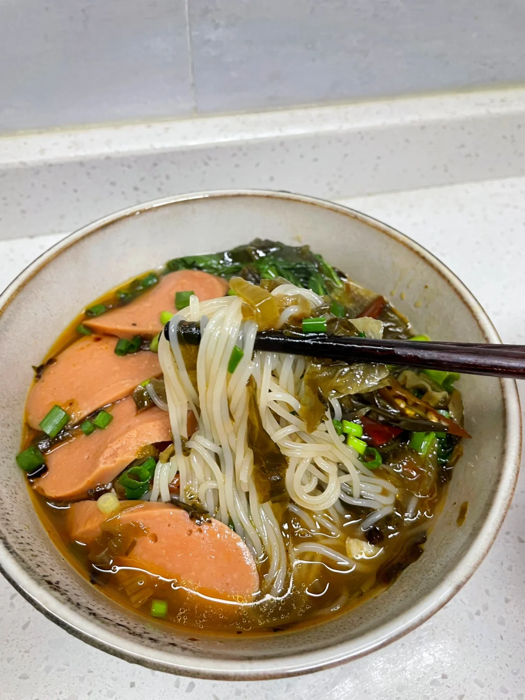 酸酸辣辣的酸菜火腿米线,超级开胃🤤