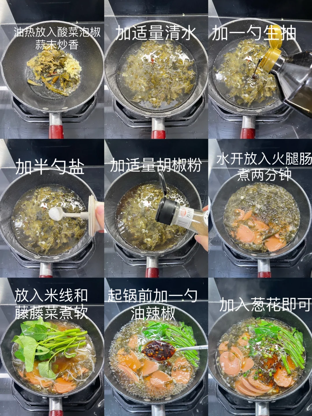 酸菜火腿米线也太好吃了,酸酸辣辣,开胃解腻,一碗下去鼻子都通了,不仅美味还能治鼻塞~ 食材:米线 酸菜 泡椒 空心菜 火腿肠 配料:蒜末 葱花 盐 生抽 油辣椒 胡椒粉 1⃣️:油热倒入酸菜 泡椒 蒜末炒香,加适量清水,加生抽 盐 胡椒粉烧开 2⃣️:水开后放入火腿肠煮2分钟,再放入空心菜和米线煮软,最后加一勺油辣椒和葱花即可