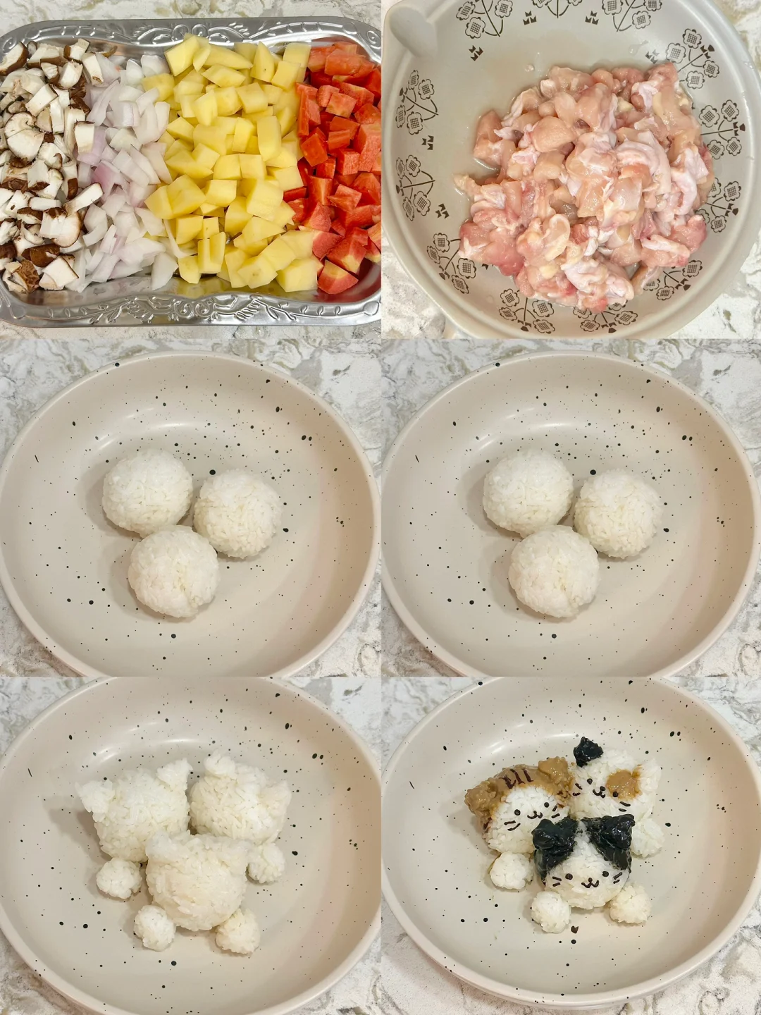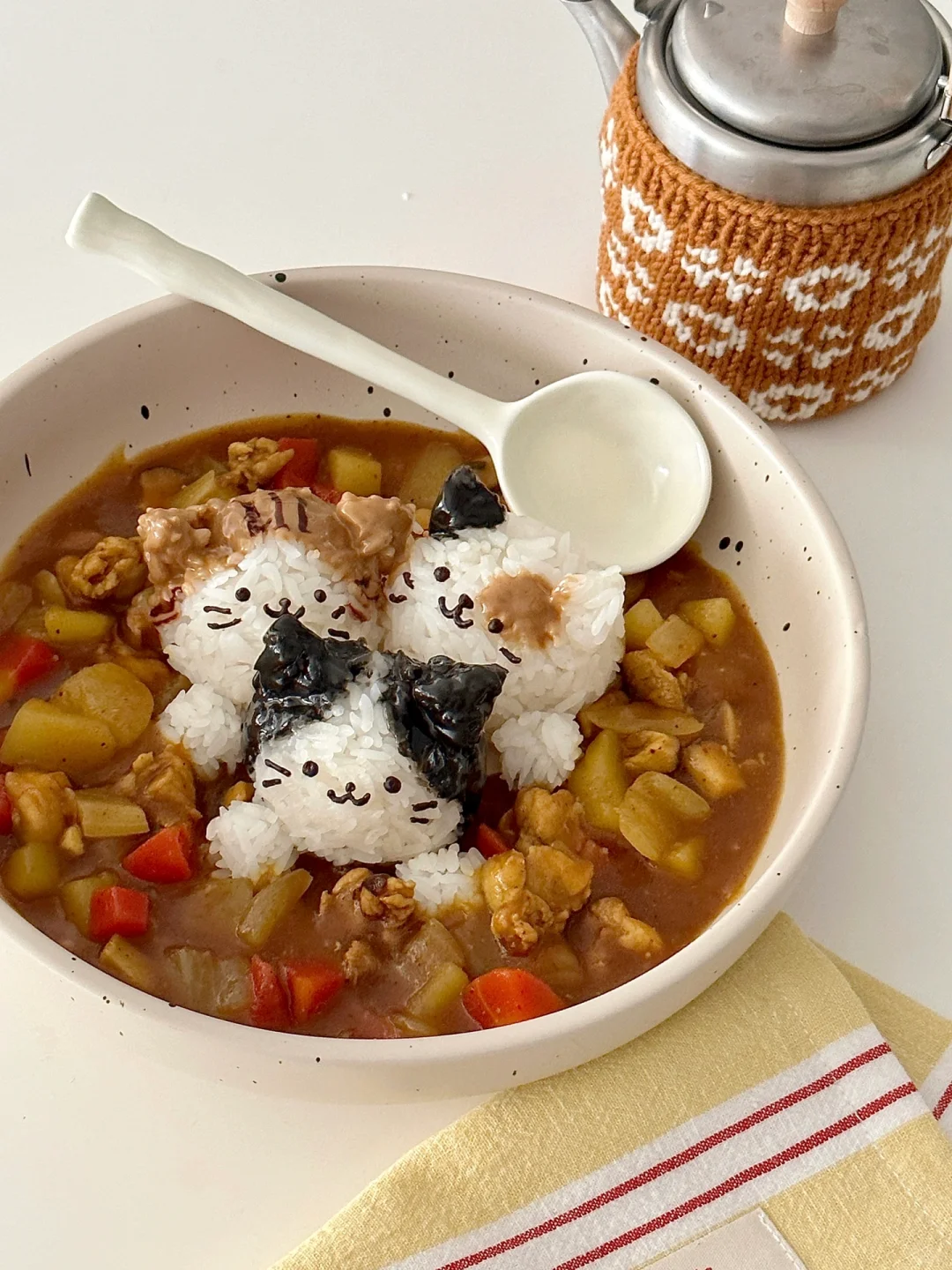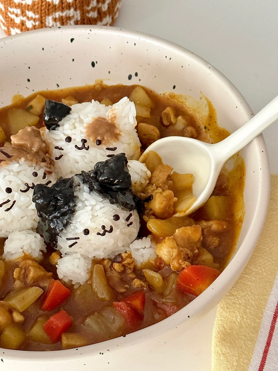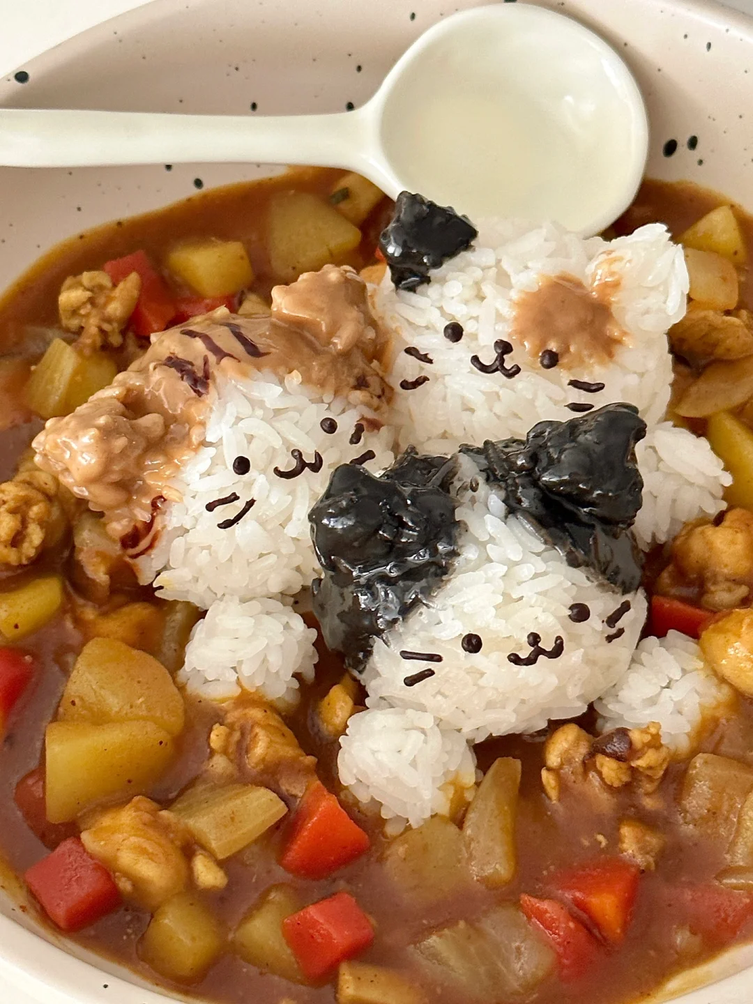 将米饭捏成可爱的猫咪,搭配辣口的咖喱饭,实在是下饭!![偷笑R]