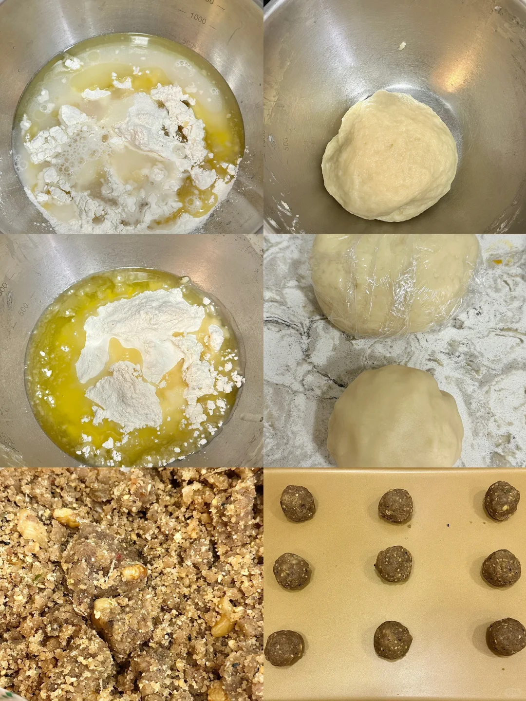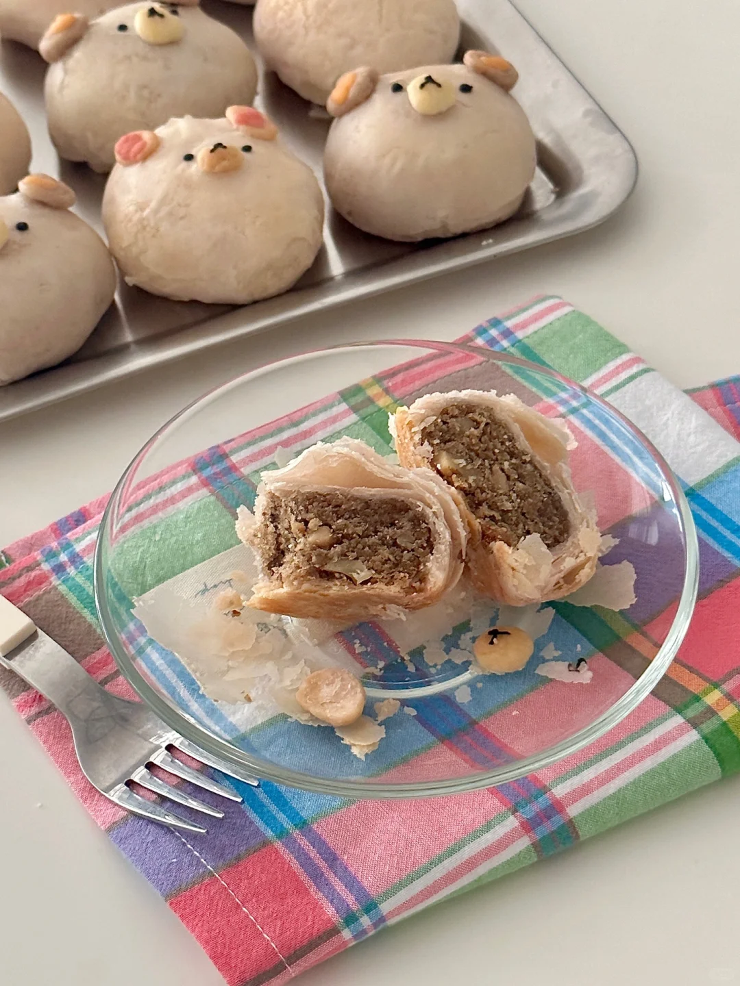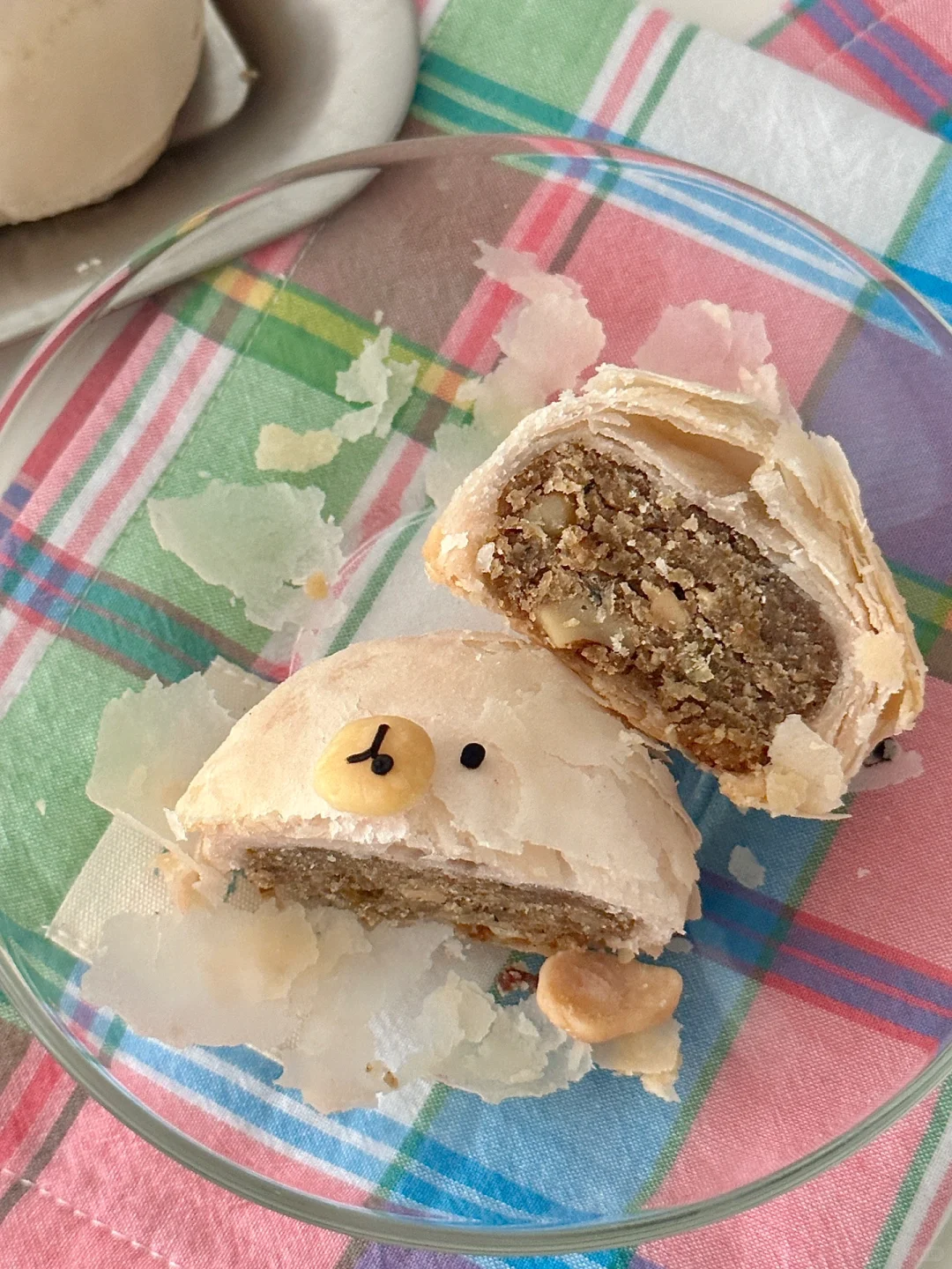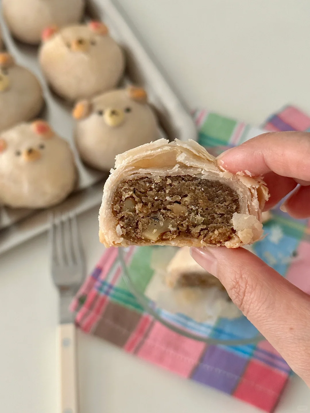 葱香五仁馅儿:瓜子,核桃仁,等自己爱吃的坚果炒熟,加入油,炒熟的低筋面粉,椒盐,五香粉,搅打好的大葱末,抓拌均匀