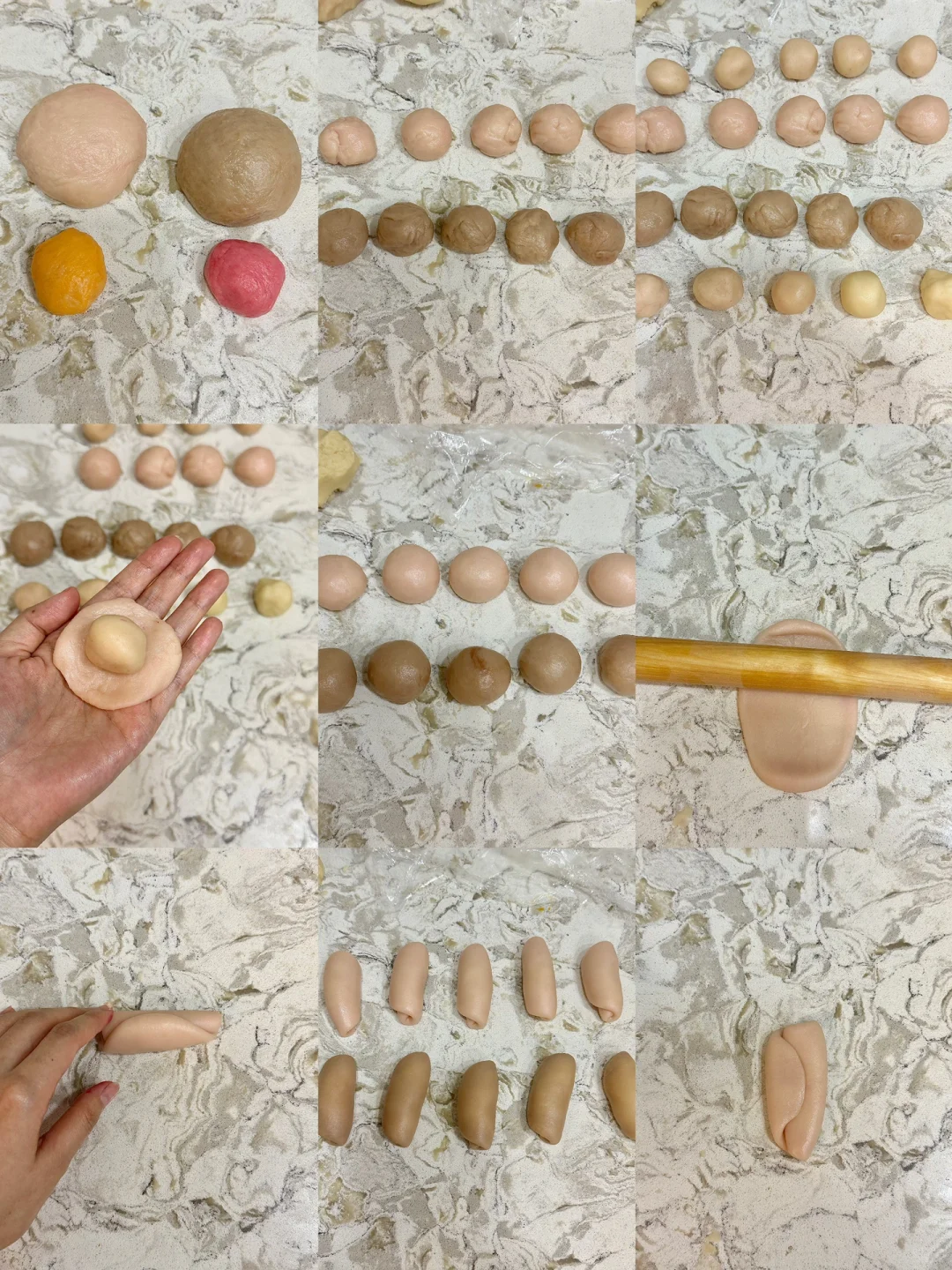 ③油皮对半分可食用色素粉色可可粉黄色,分别如图示上色,把油皮分成20g/个(肉粉的五个,棕色五个)油酥分成12g/个(共十个)