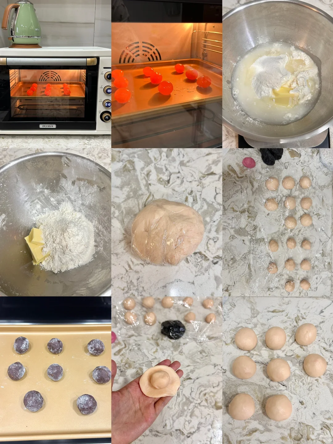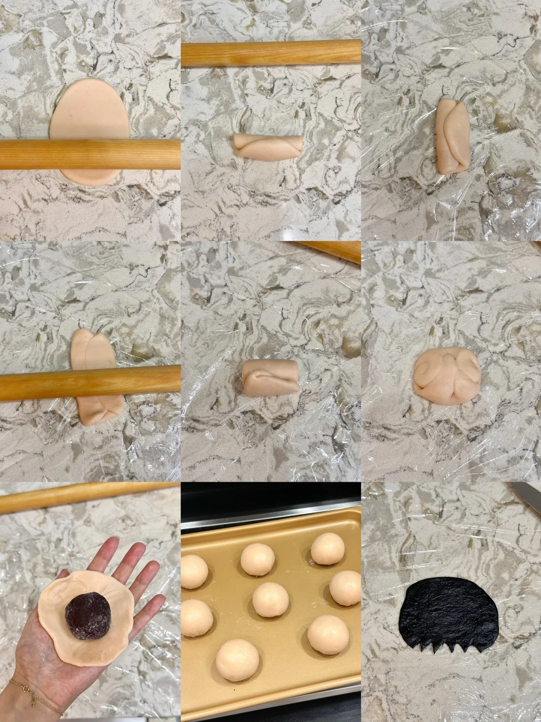 ④油皮22g,油酥11g,豆沙20g均分成八等份,剩下的油皮竹炭粉,玫红色色粉染色