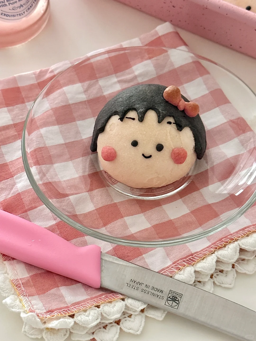 ⑤如图示包出蛋黄酥,制作头发,腮红及眼镜(也可参考往期蛋黄酥图文教程)tips:擀皮的时候垫一张保鲜膜在下面可防止破酥,也更好揭取哦[萌萌哒R]