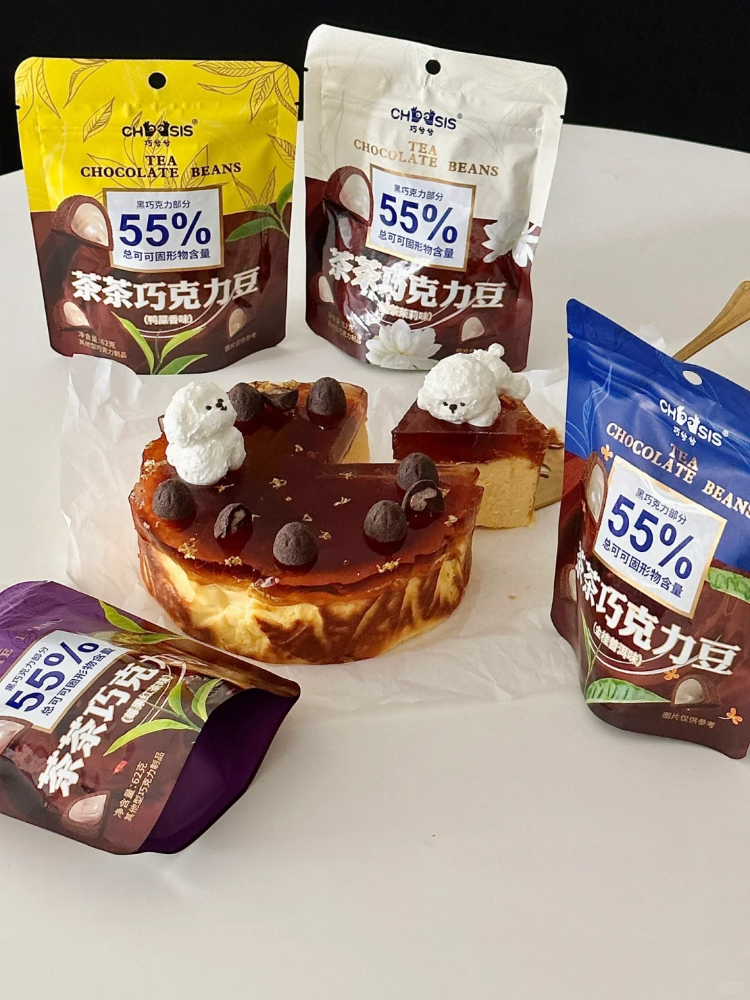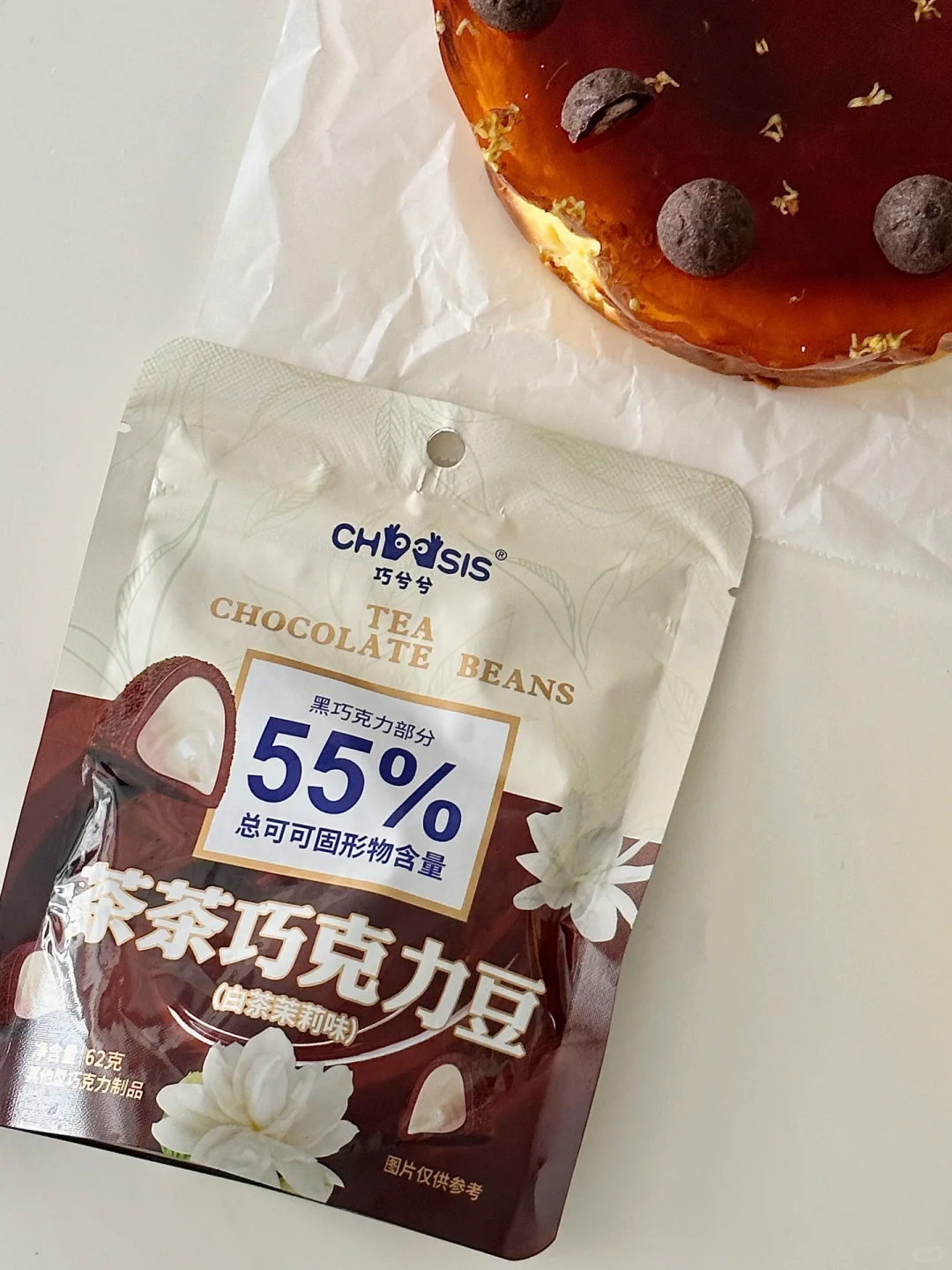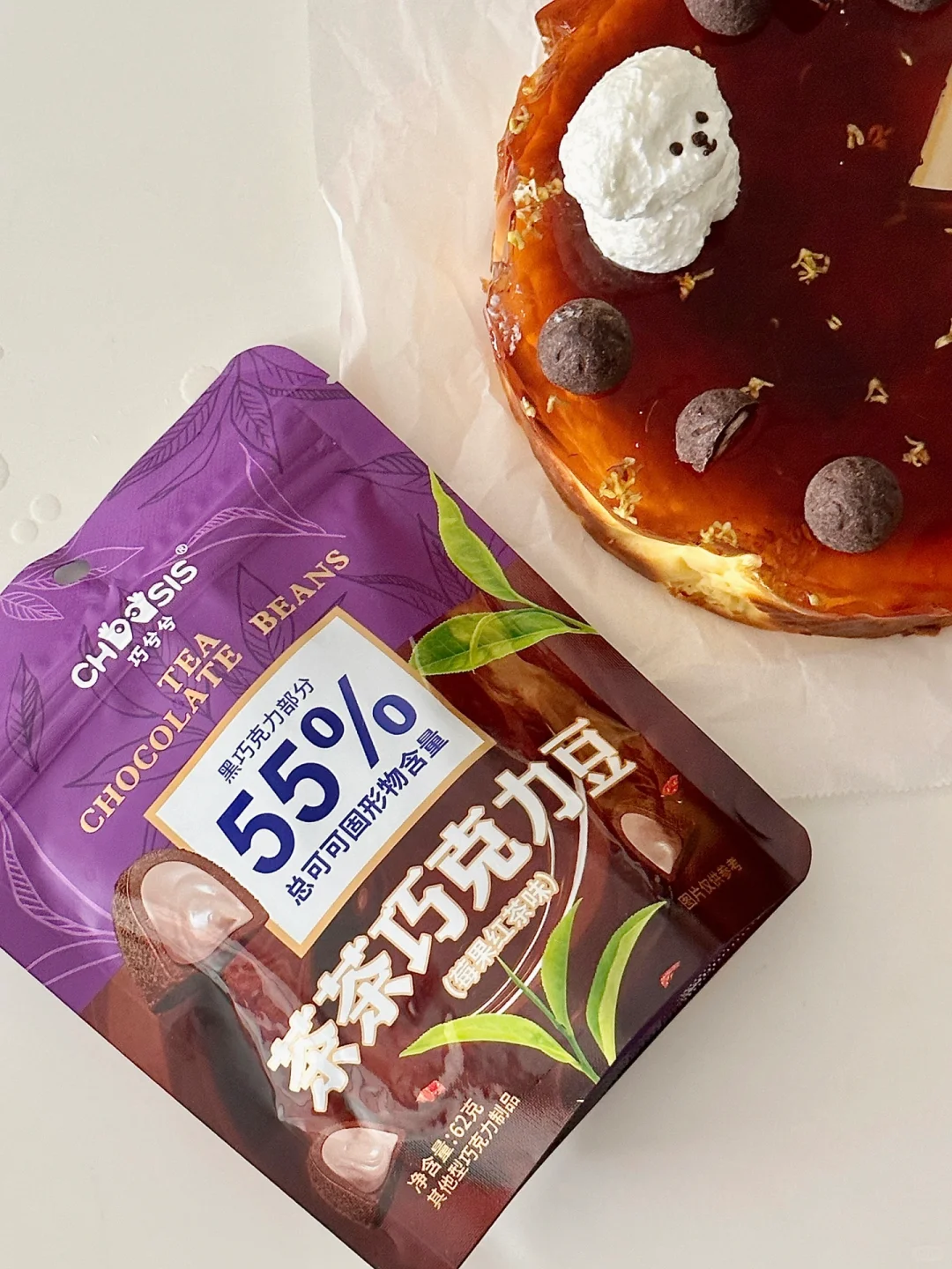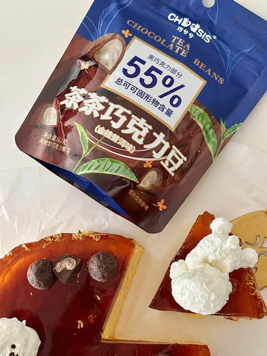 桂花普洱的清苦中和了巴斯克的甜腻,搭配起来真的刚刚好。点缀上茶香四溢的巧兮兮茶茶巧克力豆,又多了一层美味口感![飞吻R]