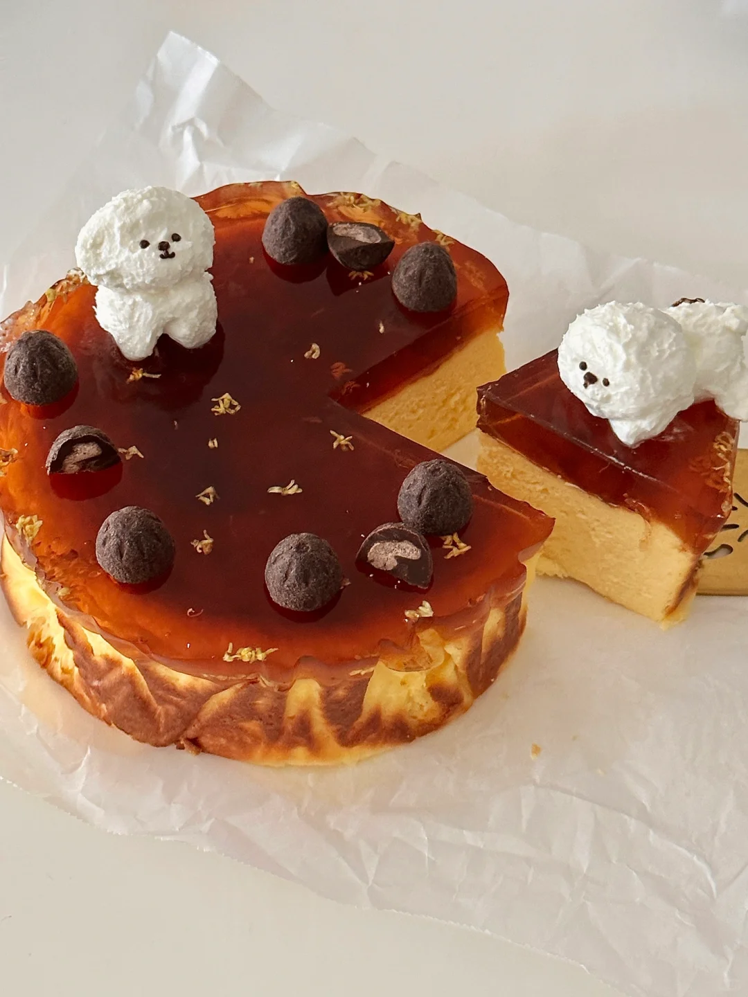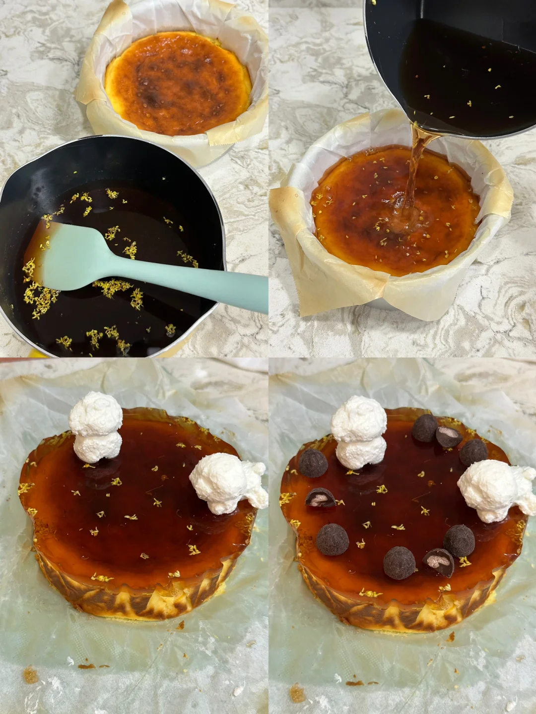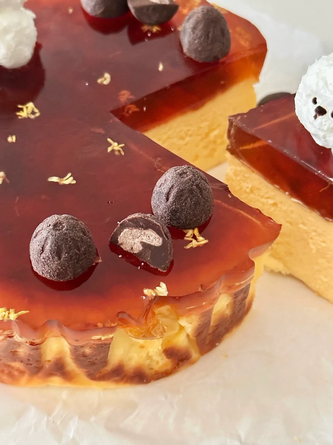 ⑦普洱茶➕桂花倒入锅内小火加热至温热状态,加入吉利丁片搅拌完全融化,倒入巴斯克蛋糕中,冰箱冷藏两小时左右即可