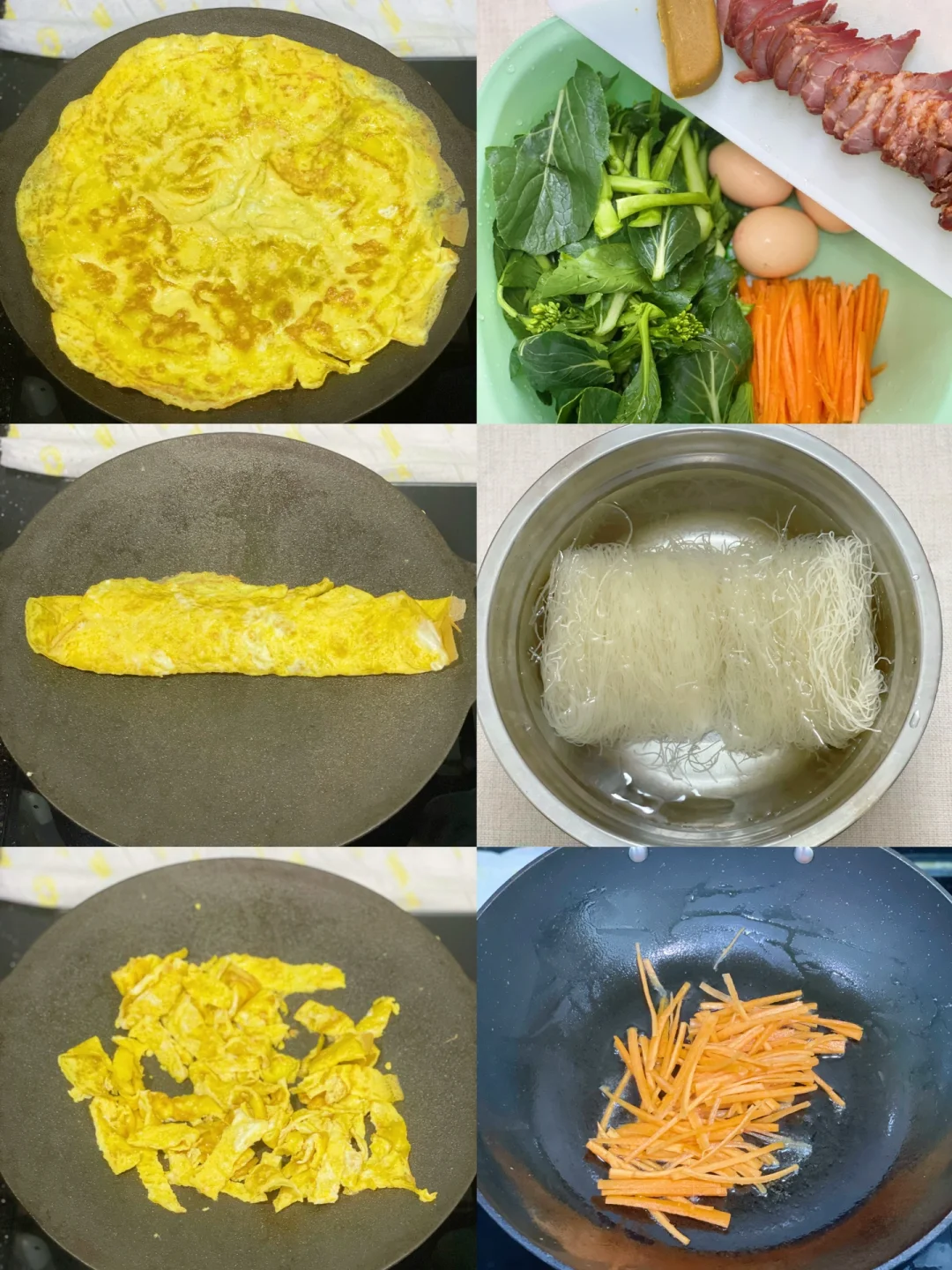 1️⃣鸡蛋大散在不粘锅中煎成蛋饼,用锅铲把鸡蛋切条备用