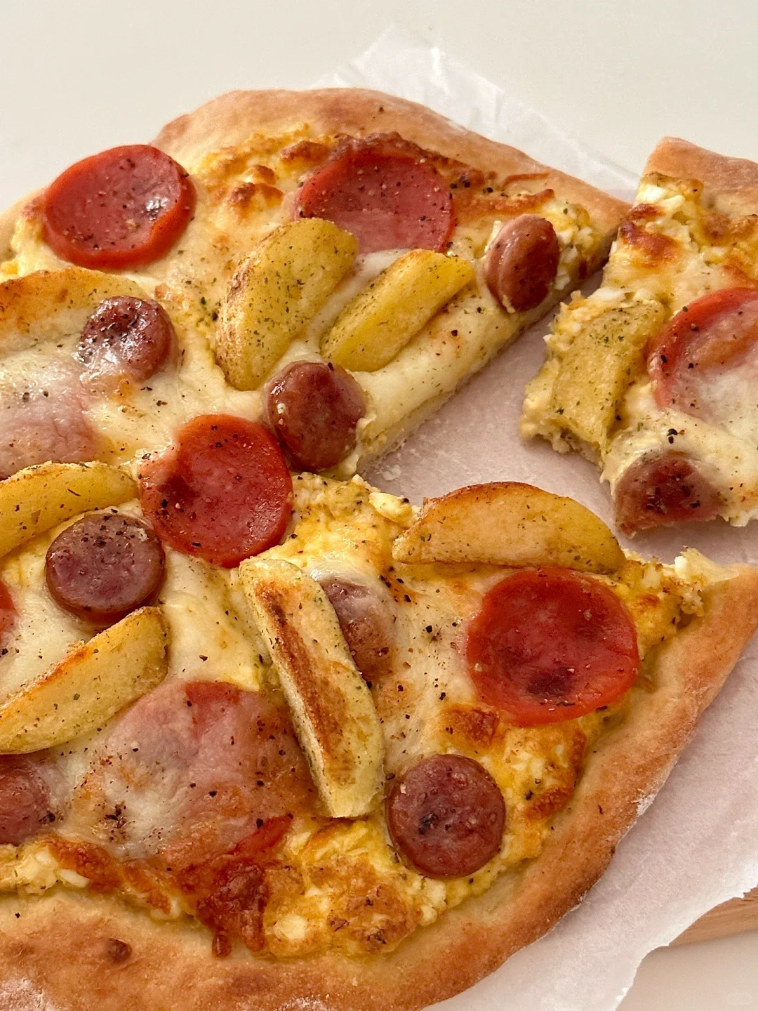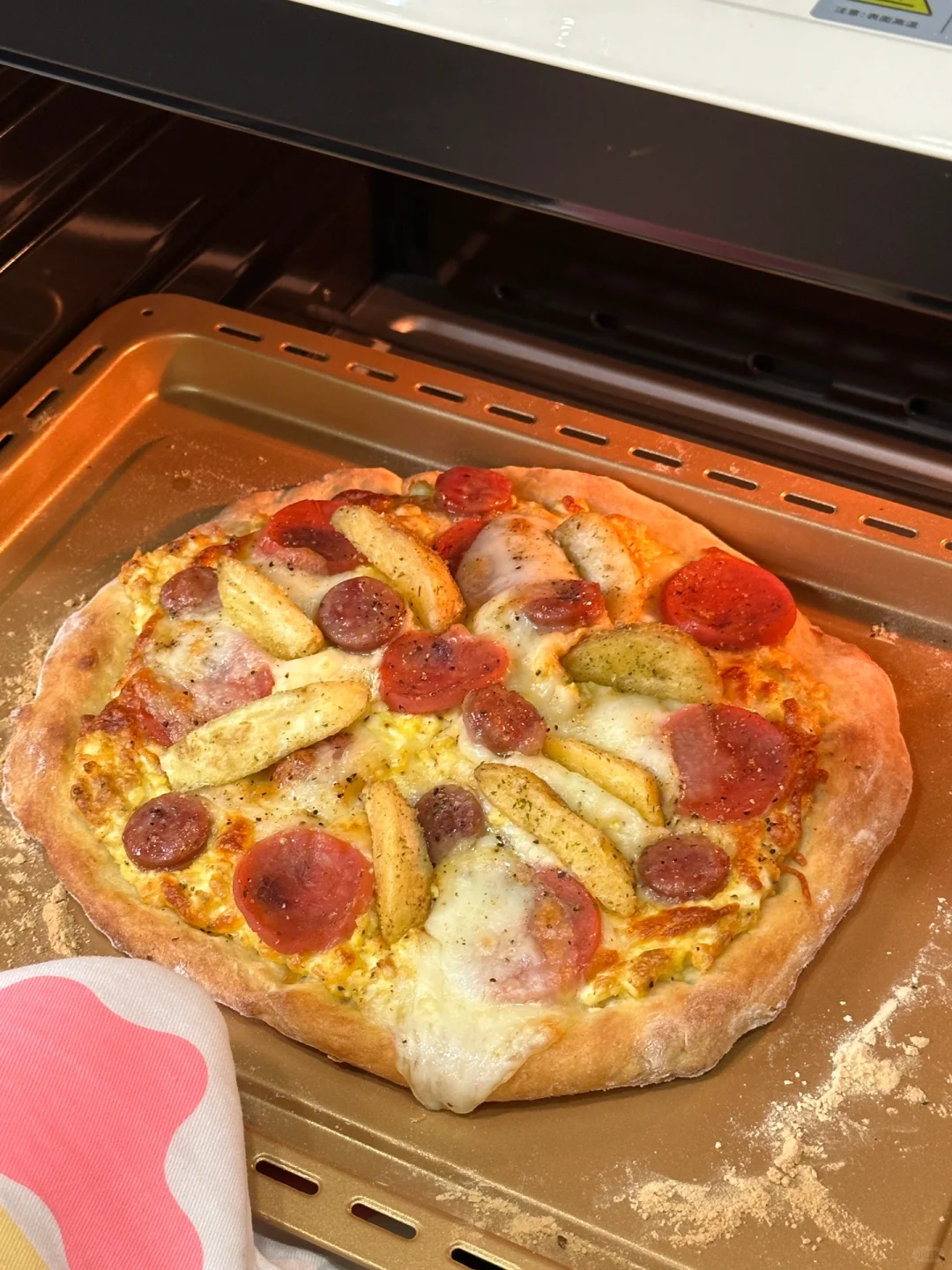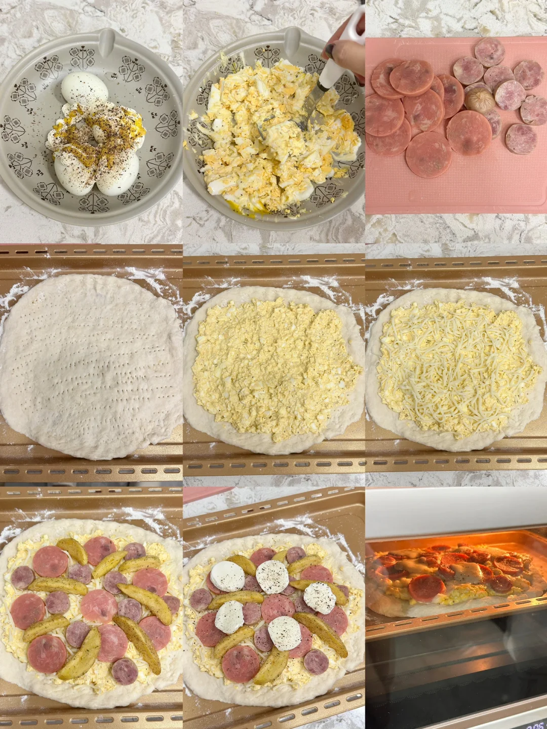 不用揉面不用隔夜发酵也可以拥有酥脆大气泡饼底,自制黑胡椒海盐沙拉鸡蛋酱打底,铺上厚厚的马苏里拉芝士碎,加之不同的风味火腿,欧芹薯角,最后点缀马苏里拉新鲜奶酪。是真的好吃😋