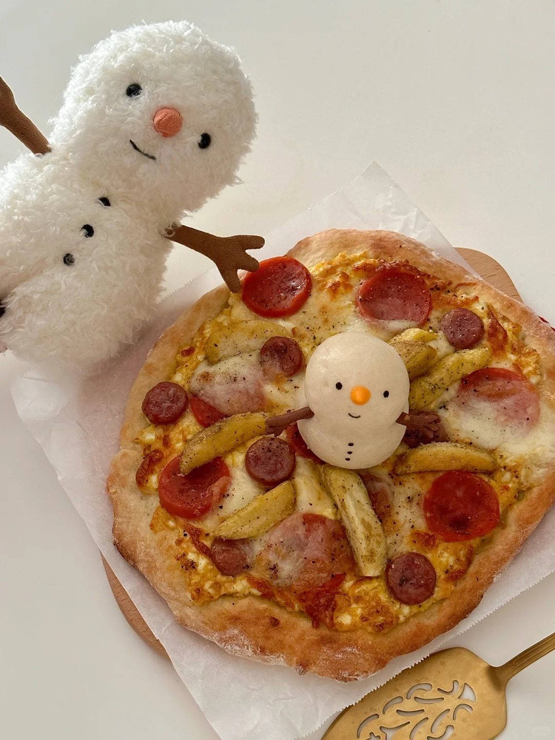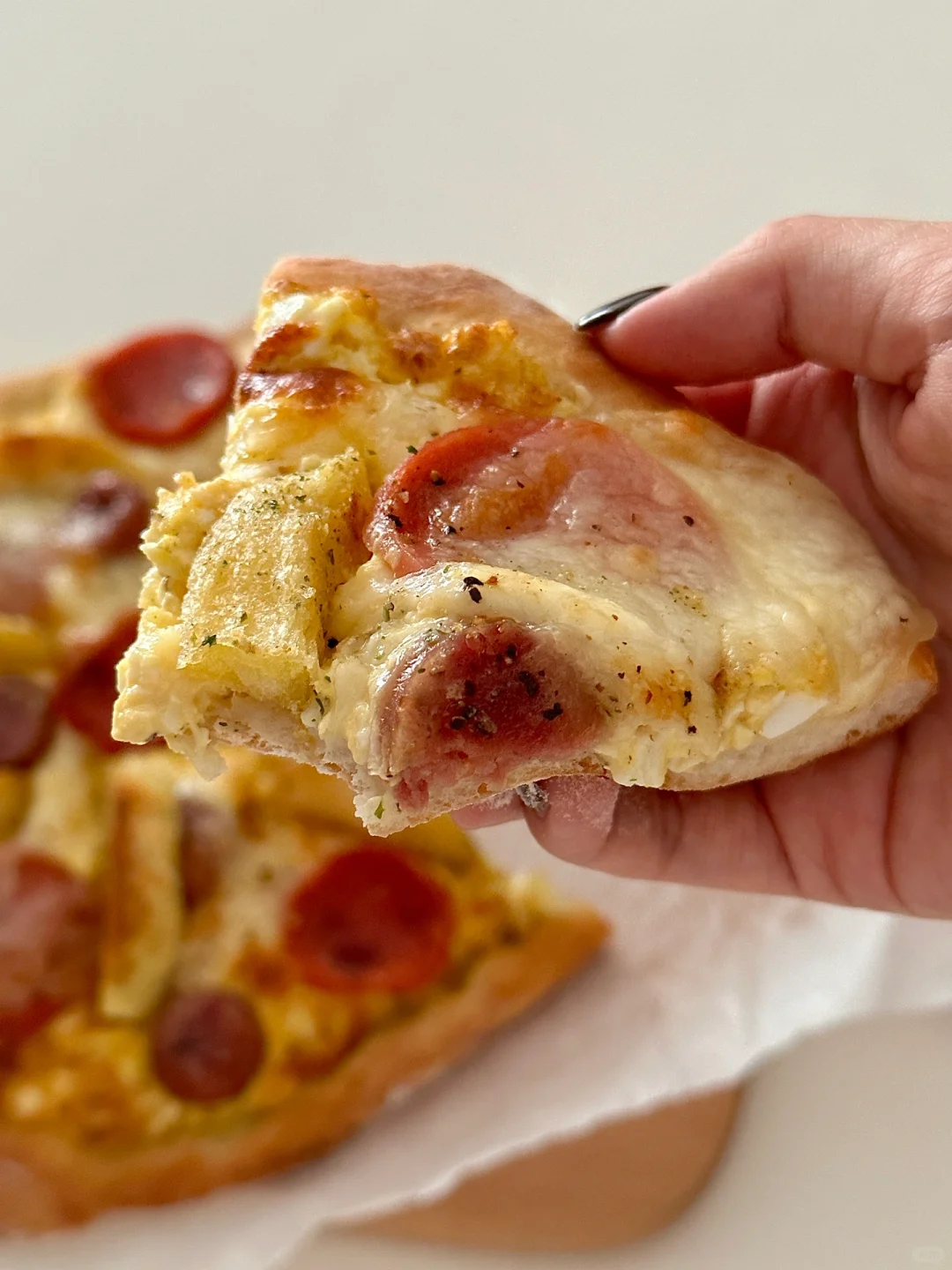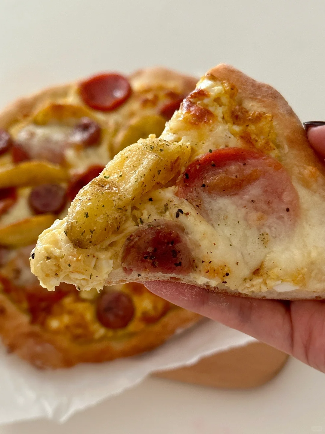 不用揉面不用隔夜发酵也可以拥有酥脆大气泡饼底,自制黑胡椒海盐沙拉鸡蛋酱打底,铺上厚厚的马苏里拉芝士碎,加之不同的风味火腿,欧芹薯角,最后点缀马苏里拉新鲜奶酪。是真的好吃😋