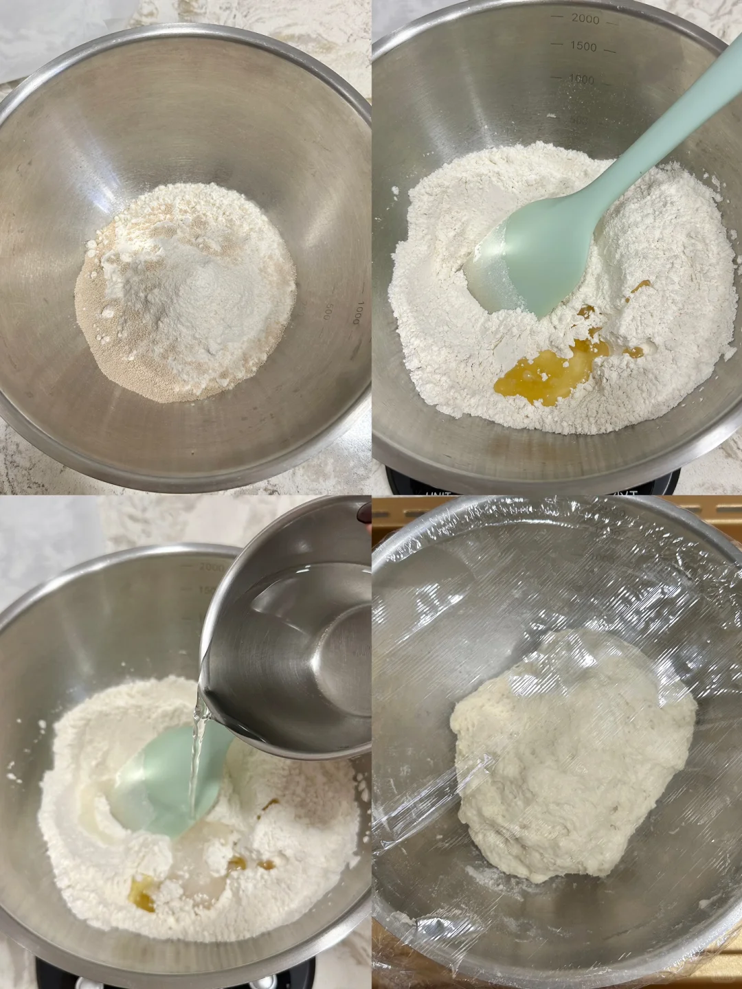 高筋面粉135g,常温水100g,盐3g,5g砂糖,橄榄油5g,酵母4g