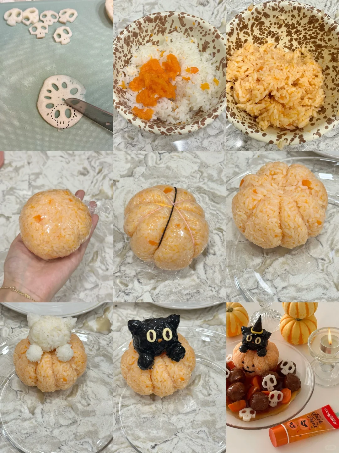 ③米饭蒸熟,胡萝卜或者南瓜蒸软烂,捣碎,加入米饭中染成橙黄色。按照图示,做出南瓜形状